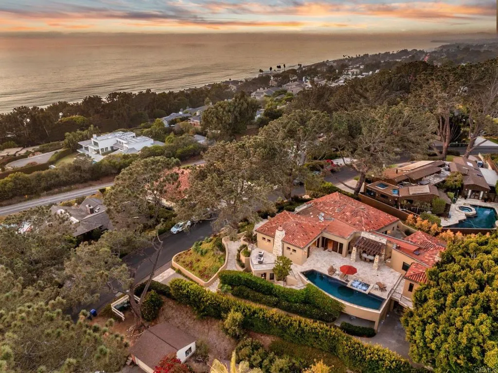 Sweeping panoramic ocean and sunset views define this modern Santa Barbarastyle 4-bedroom, 4.5-bath estate, a masterpiece of design by renowned architect Ron Wilson. Set on nearly 18,000 square feet of lush, private grounds, this Del Mar luxury residence captures the essence of Southern Californias coastal lifestyle, where architectural artistry and natural beauty meet. Every vantage point reveals the Pacific in all its brilliance, with radiant sunsets painting the horizon nightly. The resort-inspired grounds feature tranquil garden seating, meditation areas, and tropical landscaping, offering total privacy and serenity. Inside, 5,472 square feet of refined living space flow seamlessly between open-concept gathering areas and intimate retreats. The great room, anchored by a chefs kitchen with Sub-Zero and Wolf appliances, custom cabinetry, and designer stone finishes, opens to an expansive terrace with an infinity-edge pool, spa, and ocean-view dining pavilionideal for entertaining or simply savoring Del Mars signature sunsets. The estate also features a lush grassy lawn and landscaped garden areas. The primary suite offers a peaceful retreat with breathtaking ocean vistas, dual walk-in closets, and a spa-inspired bath featuring a soaking tub and oversized shower. Three additional en-suite guest bedrooms ensure comfort and privacy for family and visitors, while a private home theater creates the perfect space for cozy movie nights. Additional highlights include a home elevator, two-car garage with carport, and an approved site for a future ADU or guest casita. The property