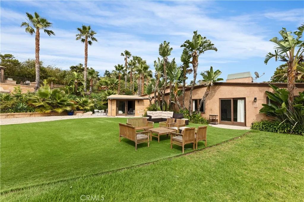 Ocean-view, single-story custom estate located behind a private double-gated entry on approximately one acre of lush, landscaped grounds. This highly upgraded residence offers 4 bedrooms and 4 bathrooms across approximately 3,700 square feet of elegant living space. The expansive property features breathtaking Pacific Ocean views, mature landscaping, fruit trees, an organic garden, and a large grassy lawn overlooking the coastline. Outdoor living is enhanced by extensive stonework surrounding the spa, built-in BBQ center, and an entertainers party deck with observation area. Enter through stone flooring into the grand great room showcasing soaring wood-beamed ceilings, a striking stone fireplace, built-in bookcases, and a flat-screen TV with surround sound. The space opens seamlessly to the custom remodeled chefs kitchen featuring a professional range with pot filler, Sub-Zero refrigerator/freezer, stone countertops, mosaic tile backsplash, wine refrigerator, and center island. Bi-fold doors create exceptional indoor/outdoor living, ideal for entertaining and enjoying the ocean breezes. The primary suite offers stunning ocean views, a cozy fireplace with mounted flat-screen TV, French doors opening to the yard and spa, a generous sitting area with built-in desk and bookshelves, and a beautifully remodeled spa-inspired bath with European-style enclosed steam shower and soaking tub. Additional highlights include a custom home theater with surround sound and lofted viewing lounge. The second bedroom is en-suite and enjoys beautiful ocean views, while the additional bedrooms 3