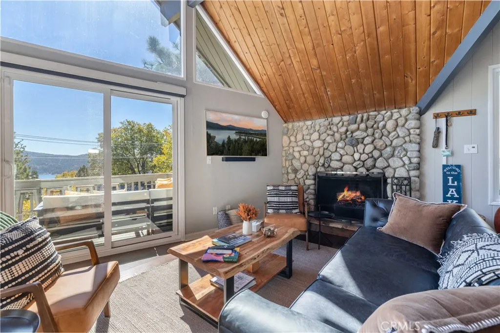 Lake View A-Frame Retreat Fully Furnished & Turnkey! Welcome to your immaculately maintained, fully furnished A-frame retreat with stunning lake views, nestled in the heart of Lake Arrowhead on desirable Matterhorn Drive. This exceptional property blends timeless mountain charm with modern comfort, offering the perfect escape for relaxation or adventure. Surrounded by mature pine trees, the inviting exterior sets the tone for what awaits inside. The open-concept floor plan is filled with natural light, featuring soaring ceilings and expansive windows that showcase breathtaking views of the lake and surrounding mountains. The gourmet kitchen is beautifully appointed with stainless steel appliances, granite countertops, and generous cabinetry, flowing seamlessly into the warm and welcoming living area. A cozy fireplace anchors the spaceideal for gathering on crisp mountain evenings. Designed to comfortably accommodate family and guests, this home is also an established short-term rental. The primary suite serves as a private sanctuary, complete with its own balcony overlooking the serene landscape and a well-appointed eon-suite bath. The lower level offers a secondary entertainment space plus a versatile bonus roomperfect for a wine cellar or tasting room, reading nook, or home office. Step outside to your private outdoor oasis. The spacious upper deck invites you to unwind in the fresh mountain air, while the expansive backyard features two additional entertaining areasideal for hosting, gardening, or simply enjoying nature. Just minutes from Lake Arrowhead Village, youll e