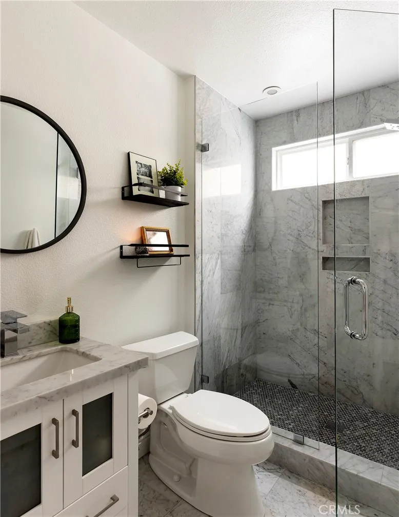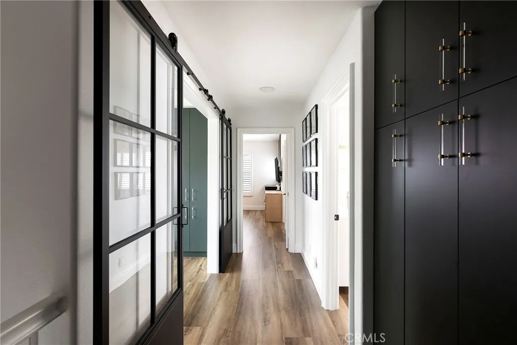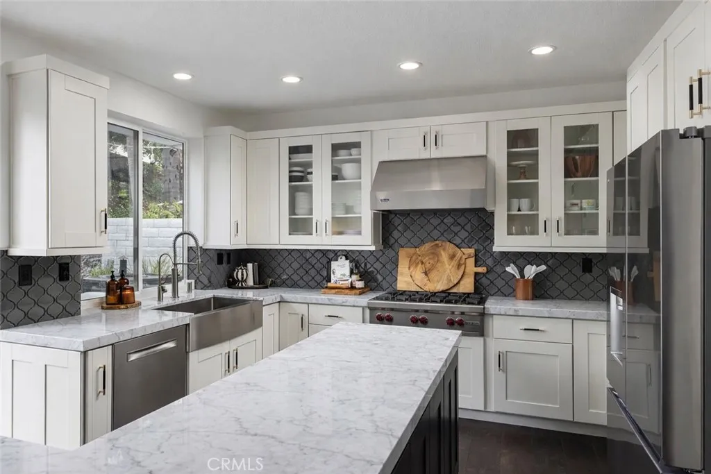 Thoughtfully upgraded with designer details at every turn, this extensively improved home offers a rare opportunity to enjoy a fully updated residence in guard-gated San Joaquin Hills. From the moment you step inside, the living room creates an inviting first impression. The space flows seamlessly into the family room in a beautifully open layout enhanced by the removal of the wall between the living and family rooms. Custom built-in cabinetry and a fireplace with designer tile create a warm and comfortable setting for everyday living. Just beyond, the dining room becomes a statement space with designer wallpaper, a Mitzi chandelier, and a custom built-in dining bench designed for intimate meals and memorable gatherings. The chefs kitchen serves as the heart of the home, showcasing Carrara marble countertops, an Italian glass tile backsplash, white Shaker cabinetry, a 6-burner Wolf range, Viking hood with heat lamps, double ovens, Bosch dishwasher, wine refrigerator, and a stainless steel farmhouse sink with reverse osmosis filtration. French doors extend the living experience outdoors to a thoughtfully designed backyard with designer tile hardscape, artificial turf, and a modular BBQ station ideal for year-round entertaining. The main level features a flexible bedroom with a built-in Murphy bed and an updated Carrara marble bathroom, ideal for guests, multigenerational living, or a private office. Upstairs, the loft addition offers versatility and may serve as a sixth bedroom, providing a private retreat with iron and glass doors, custom media cabinetry, and a built-in wor