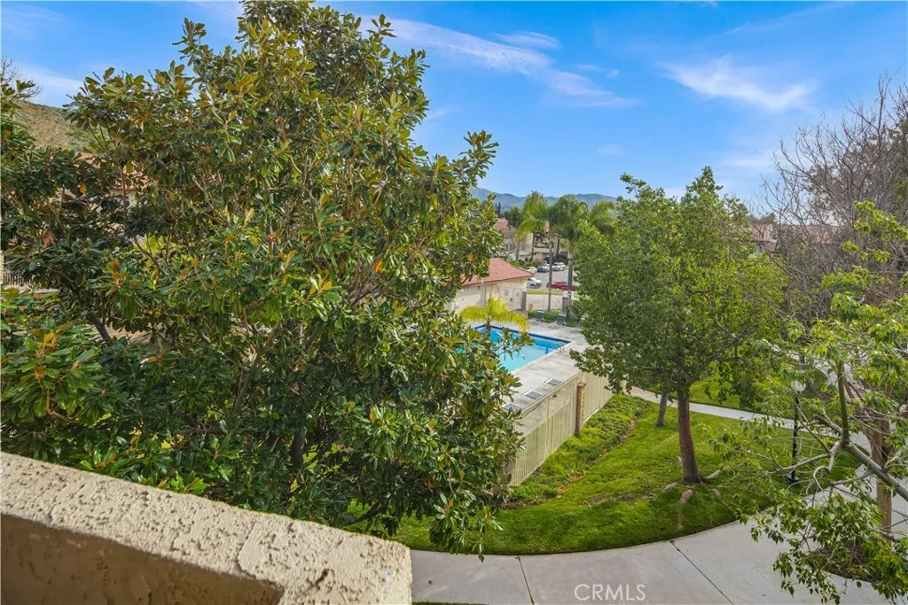 Welcome to this move-in ready top level condo, beautifully remodeled and ideally located overlooking the community pool and greenbelt. A mature magnolia tree adds privacy from the balcony while still allowing open views. The living room features high ceilings and a full custom built-in with open display shelving above and enclosed cabinet storage below, creating a true focal point. The dining area is finished with custom wall trim and flows into the updated kitchen with stainless steel appliances, freshly painted cabinetry, and porcelain countertops. The remodeled guest bath includes in-unit laundry for added convenience. The primary bedroom offers a walk-in closet and an updated en-suite bathroom. A 2 car tandem garage is attached to the building for easy access. The community includes 5 pools, multiple playgrounds, and HOA dues cover water and trash.