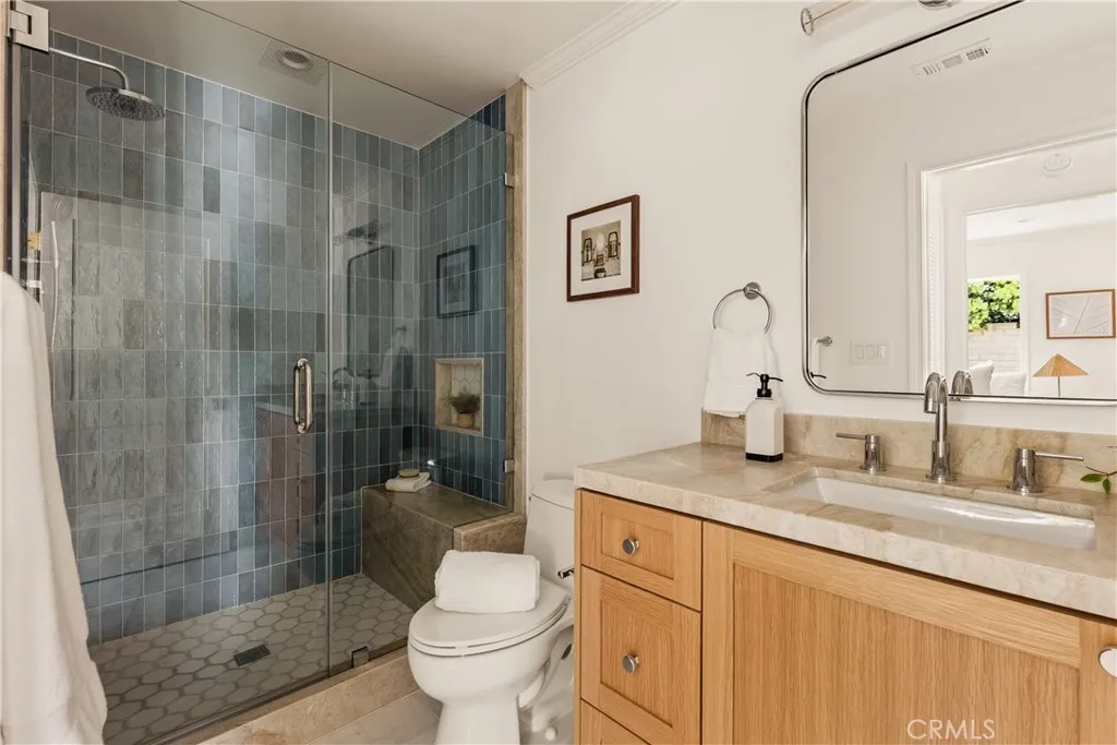 Experience a thoughtfully private compound, this residence evokes elegance and a distinctly modern sensibility. Each space has been curated with hand-selected finishes - from the custom kitchen, to the high end details. The arched living room wall introduces a warm, textural sophistication that continues throughout this exceptional home. The kitchen offers the perfect balance of form and function. Anchored by a substantial center island, this space features Caf appliances, a custom designed hood and an expansive walk-in pantry outfitted with custom built-in shelves. Designed with both entertaining and everyday living in mind, it opens seamlessly to the home's main living areas, creating a fluid, sunlit space where gatherings unfold with ease. The main residence offers four bedrooms and three baths, including a versatile suite that opens to a serene patio - ideal for guests or a tranquil home office. The primary suite features an oversized walk-in closet, and spa-like bath. Beyond the interiors, an extraordinary outdoor sanctuary awaits, along with Podocarpus trees and multiple seating areas. The outdoor space gracefully links the main residence to a fully equipped ADU, complete with a private bedroom and bath, full kitchen, and laundry, offering exceptional versatility and opportunity. Set within a close-knit, highly desirable neighborhood with premier access to top-tier schools, the beach, golf, shopping, and dining, this estate is a rare opportunity to live beautifully, live effortlessly, and live inspired.