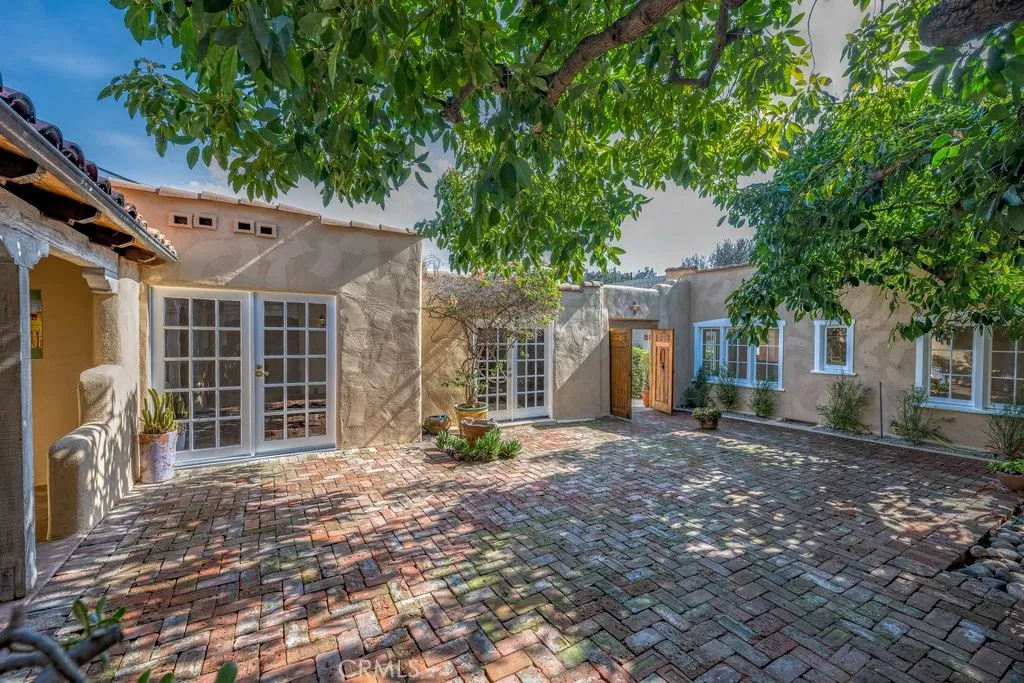 Welcome to this charming Spanish-style home in Sierra Madre. Originally built in 1926, this 2,365 SF (approx.) Hacienda-style residence sits on a 7,492-SF lot and is designed around a large, private central courtyard paved in antique brick and shaded by a mature, fruit-bearing avocado treesetting the tone for the homes indoor-outdoor lifestyle. The front portion of the home opens to a warm living room highlighted by a Batchelder-style tile fireplace and newer windows. A welcoming dining area flows seamlessly into the spacious eat-in kitchen, offering abundant custom cabinetry and ample counters. The kitchen connects effortlessly to the outdoor spaces, where a covered portico with built-in banquettes and hand-painted tile frescoes leads to a covered outdoor dining area ideal for al fresco entertaining. Hardwood floors enhance the front portion of the home, complemented by updated light fixtures and fresh int/ext paint that preserve its timeless character. This wing is equipped with central air and heat and includes 2-bedrooms and 1 full bath. The rear portion of the home, built more recently and accessed across the central courtyard, offers exceptional privacy and flexibility. It begins with a private primary suite featuring French doors opening to the courtyard, a corner kiva Southwest-style fireplace, and a walk-in closet leading directly into the primary bath. The suite also includes a built-in desk area with shelving and direct access to the rear yard. The laundry area is conveniently located within this wing. A generous family room features French doors to the courtyard