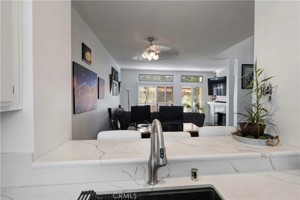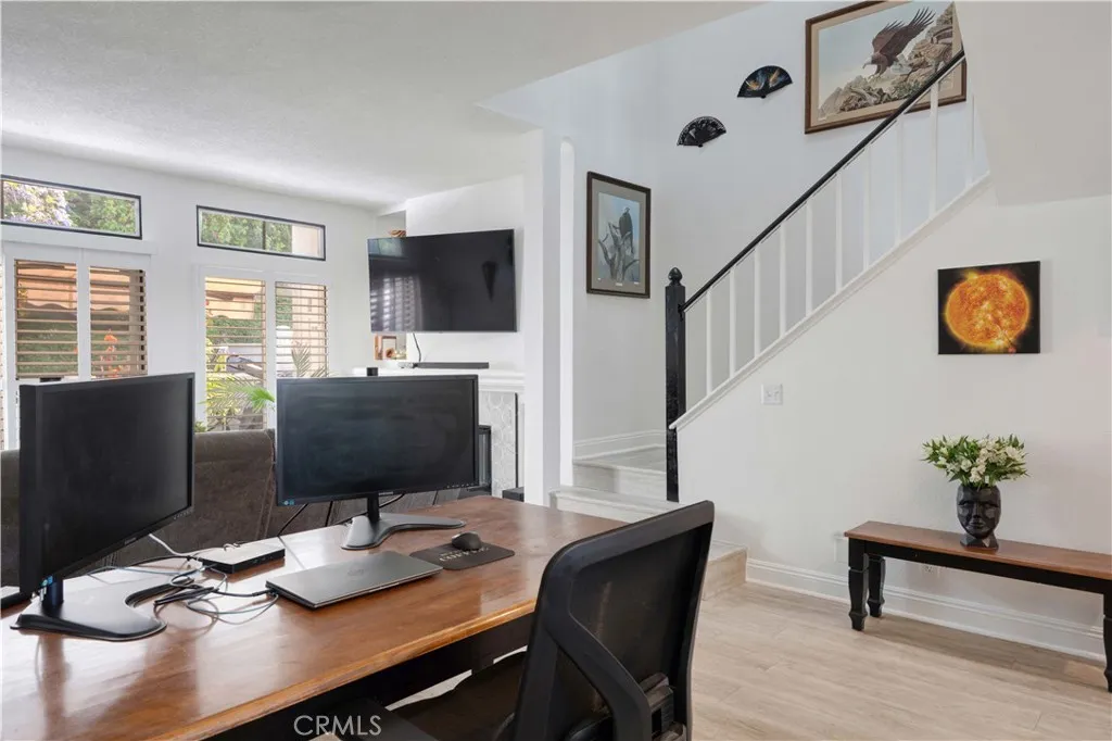 Welcome home to this beautiful residence located in the exclusive gated community of Bridgeport Terrace. This inviting property features two bedrooms, two and a half bathrooms, an attached garage and a host of upgraded amenities. Upon entering, you will be greeted with oak laminate wood flooring that flows effortlessly throughout the open floor plan. The kitchen features quartz countertops, recessed lighting and bar seating, while the adjacent dining area makes for easy entertaining. The spacious living room centers around a gorgeous, custom tile-surround fireplace, all while overlooking the private, serene patio. A convenient guest half-bath is located downstairs, as well as an in unit, side by side laundry space. Head upstairs to find the two primary suites, each offering its own ensuite bath and walk in closet. Additional upgrades include shutters, new paint throughout, custom built ins in the living room and a contemporary staircase marked with espresso handrails and white spindles. Bridgeport Terrace features excellent amenities including a sparkling pool and spa, picnic and BBQ areas and a secure gated entry. HOA dues cover basic cable, trash service, exterior maintenance and well-maintained landscaping. Conveniently located near the 5 freeway, this home is minutes from shopping, dining, entertainment and world-renowned beaches.