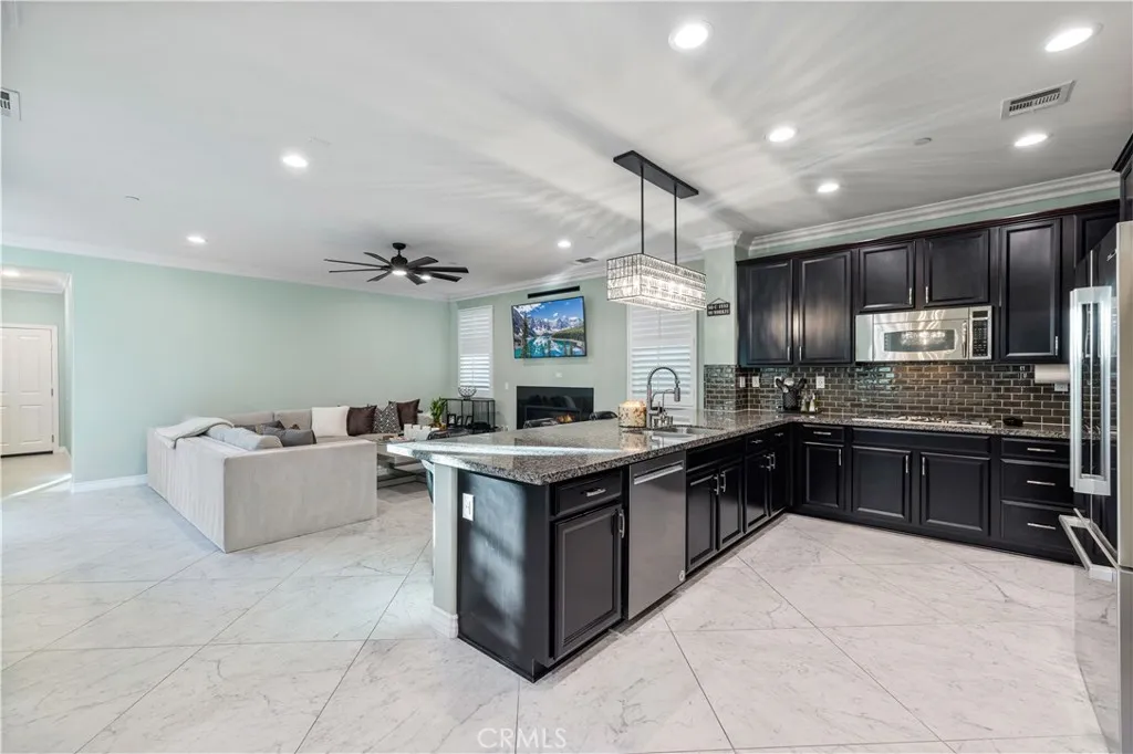 Welcome to your dream home in the highly sought-after West Creek community! This luxurious 4-bedroom, 3.5-bath home offers 2,887 sq. ft. of beautifully designed living space where not a single detail was spared. The open-concept layout features a spacious family room with a marble-faced linear fireplace, a gourmet kitchen with granite countertops, custom backsplash, an oversized island, plus a formal living room and dining area filled with natural light. Downstairs includes a full bedroom and bathroomperfect for guestswhile upstairs offers a large bonus area/loft, three additional bedrooms, and two full bathrooms with dual vanities. The elegant primary suite includes wood ceiling accents, a custom barn door, dual walk-in closets, a soaking tub, walk-in shower, and dual vanities. Additional highlights include modern tile flooring, plantation shutters, crown molding, stainless steel appliances, custom lighting, a tankless water heater, and a paid-for solar system. The laundry area is over sized and includes additional storage area. The exterior is picture-perfect, with meticulously maintained landscaping and excellent curb appeal. The backyard creates a relaxing retreat with a covered patio, recessed lighting, ceiling fan, pavers, and even a lime treeideal for morning coffee or evening wine under the stars. 3 total parking spaces, 2 garage and one uncovered next to the garage with an EV charger. Located near top-rated schools, parks, pools, and shopping, this stunning home truly exudes pride of ownership.