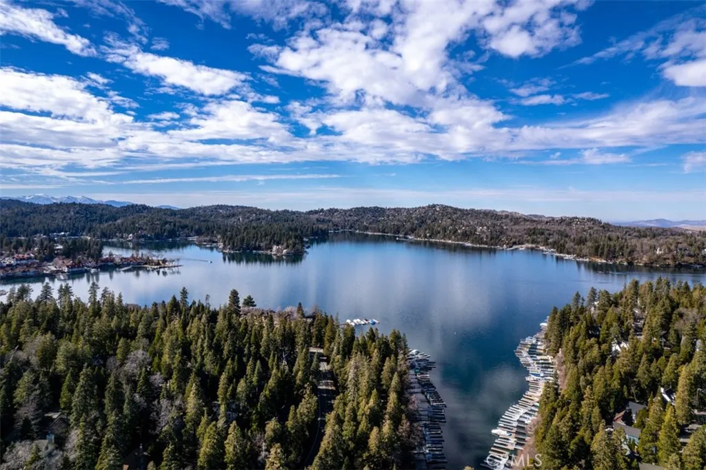 Completed in 2021 and built with one hour fire rated materials for peace of mind. This exceptional mountain retreat embodies the very best of Lake Arrowhead living, offering breathtaking mountain with coveted lake rights. Thoughtfully designed with comfort and sophistication in mind, the open-concept layout features dramatic 30-foot vaulted ceilings and expansive windows that flood the home with natural light while showcasing peaceful forest scenery. The main living space is anchored by a stunning stacked stone fireplace and enhanced by luxury vinyl plank flooring, creating a warm yet modern atmosphere. The chefs kitchen is equally impressive with white shaker cabinetry, quartz countertops, stainless steel appliances, and a generous walk-in pantry, ideal for both everyday living and entertaining. Step outside to the Trex deck to enjoy seamless indoor-outdoor living and tranquil sunset views. The lower level offers three spacious bedrooms with walk-in closets, a flexible bonus room perfect for a theater or office, and a large separate laundry room. The primary suite provides a private escape with direct deck access and a spa-inspired bathroom featuring quartz counters, matte black fixtures, and a beautifully tiled porcelain shower with penny round flooring. With approved plans for an Accessory Dwelling Unit, this home also presents excellent potential for rental income or multi-generational living, making it a rare opportunity to experience refined mountain living in one of Southern Californias most sought-after lake communitie