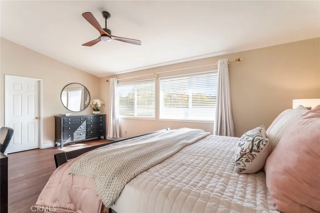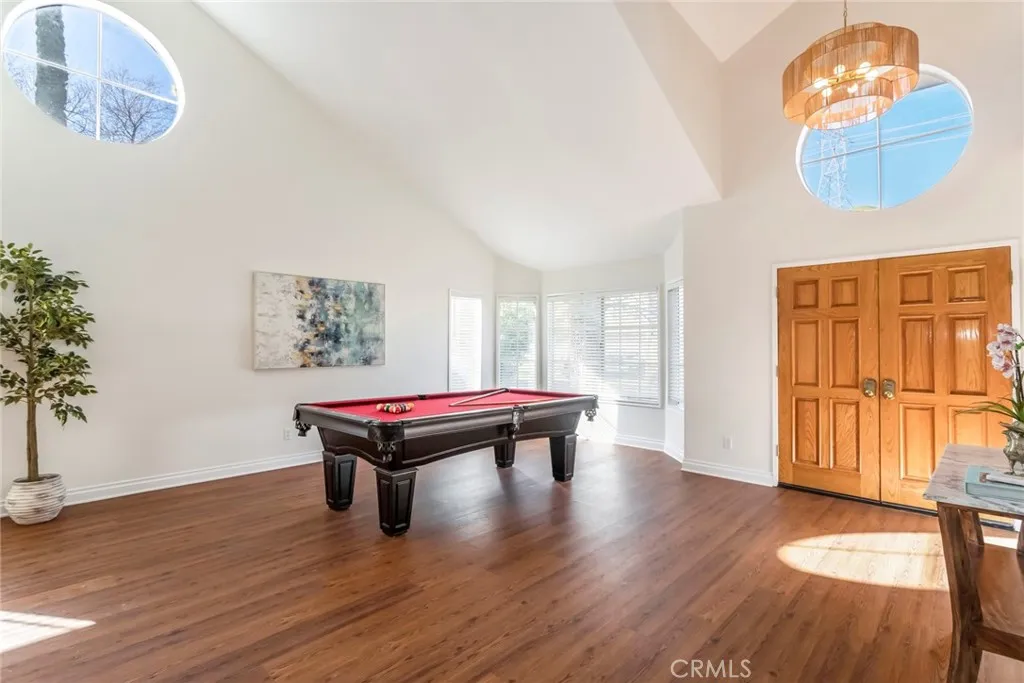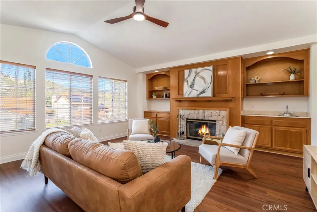 Welcome to this stunning residence, ideally situated in the heart of Santa Clarita on a picturesque street that beautifully reflects pride of ownership. From the moment you arrive, you will notice the beautiful curb appeal, highlighted by fresh exterior paint, manicured landscaping and a welcoming front porch. Spanning over 3,000 square feet, this thoughtfully designed home offers four bedrooms (including one conveniently located on the main level), a spacious bonus room/loft, three bathrooms, formal living and dining rooms, a spacious family room, and a well-appointed laundry room with sink. Upon entry, you are welcomed by soaring cathedral ceilings, warm yet neutral wood flooring, inviting designer paint selections, updated lighting, and an abundance of windows that fill the home with natural light. The chefs kitchen is both functional and inviting, featuring extensive cabinetry, stainless steel appliances, ample counter space, a center island, walk in pantry and a charming breakfast nook. The formal dining is highlighted by an elegant chandelier, creating the perfect setting for both intimate dinners and larger gatherings. The family room offers a comfortable and sophisticated space to unwind, complete with a cozy brick fireplace, wet bar, custom built-ins, and seamless access to the backyard, ideal for effortless indoor-outdoor entertaining. Upstairs, the luxurious primary suite serves as a true retreat featuring a large walk-in closet and peaceful views of the surrounding landscape. The beautifully updated ensuite bathroom features a dual-sink vanity, oversized soaking
