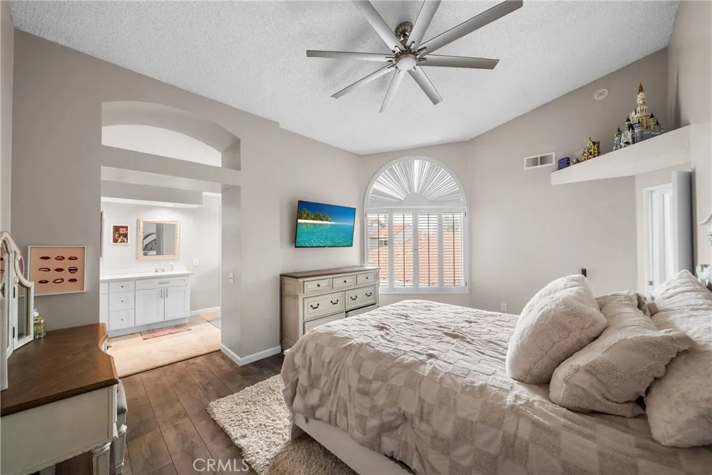 This well-appointed two-story home offers a versatile and functional floor plan in a desirable Ontario neighborhood. Laminate flooring and tile run throughout, creating a clean, cohesive look with low-maintenance appeal. The main level includes a convenient downstairs bedroom and a full bathroom with a newly renovated shower ideal for guests or multigenerational living. Formal living and dining rooms feature dramatic, soaring ceilings that create an impressive sense of space and natural light. The family room with a cozy fireplace opens to the kitchen, where the sink overlooks the private backyardperfect for everyday living and entertaining. A walk-in pantry provides excellent storage, while direct access from the two-car garage adds daily convenience. The garage also includes a laundry area with plenty of room for additional storage. Upstairs, two additional renovated bathrooms with dual-sink vanities serve the secondary bedrooms, and the open overlook showcases the homes humongous ceiling height below. The expansive primary suite is a true retreat, offering high ceilings, an oversized ceiling fan, a remodeled en-suite bathroom, and a walk-in closet. Ideally located near new shopping and dining destinations including Ontario Mills, Eastvale Gateway, and New Haven Marketplace, with quick access to schools and major commuter routes. Just minutes from Ontario International Airport, this home combines space, comfort, and exceptional convenience in Ontario.