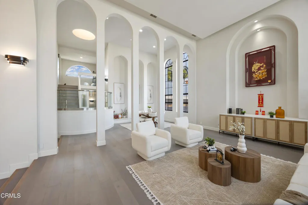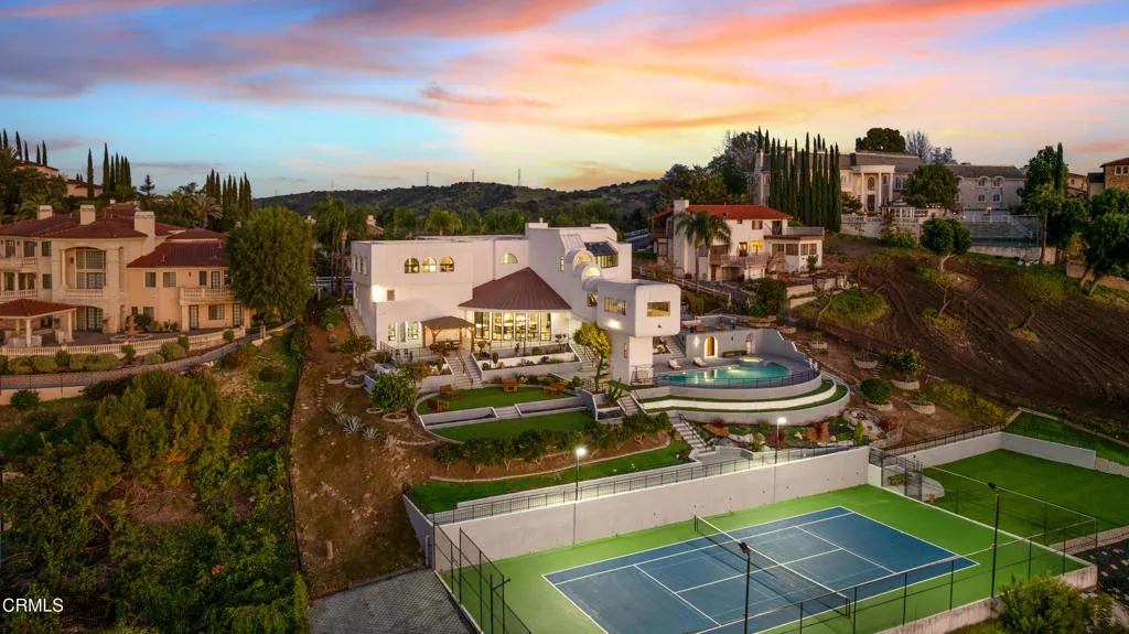 Modern Art Deco Revival Estate in The Country EstatesA rare architectural statement within the prestigious 24-hour guard-gated Country Estates, this Modern Art Deco Revival estate commands a private, resort-caliber setting with sweeping panoramic city-light and mountain views.Set behind a grand approach, the residence blends sculptural geometry with refined Contemporary symmetry, offering a lifestyle designed for both elevated entertaining and serene everyday living.The grounds unfold as a true private resort: a full-size tennis court, elevated pool and spa terrace curves along the landscape with sweeping views, putting green, gazebo, viewing deck, and curated gardens framed by mature fruit trees, including orange, guava, kumquat, tangerine, apple, dragonfruit, and rare Leon avocado. Every element has been thoughtfully positioned to maximize privacy and panoramic vistas.Dramatically extending from the upper level, an expansive viewing and meditation tower unfolds as a light-filled architectural aerie designed as a sanctuary above it all. Framed by sweeping panoramic vistas, the elevated pavilion offers a rare vantage point for sunrise rituals, sunset reflection, and stargazing under open skies.Inside, soaring ceilings, distinguished archways, expansive walls of glass create a luminous interplay of light and space. Floor-to-ceiling windows invite the outdoors in, while an expansive floor plan offers seven bedrooms, multiple grand-scale living areas, and a private executive office with its own entrance.The chef's kitchen is appointed w/ Sub-Zero refrigeration, professional-gr