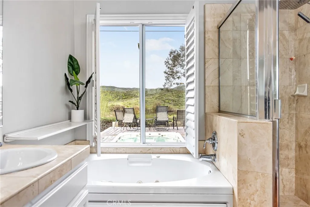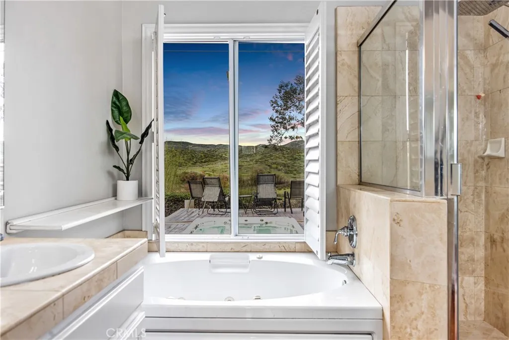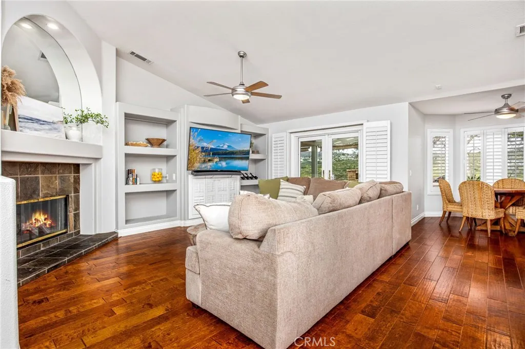Welcome to this beautifully appointed and immaculately maintained single-story home on a corner lot featuring 3 bedrooms, 2 bathrooms, 2,213 sq ft of spacious living with vaulted ceilings, NEW HVAC, NEW water heater, tons of windows keeping it light and bright, a 3-car garage and huge RV & Boat parking with the opportunity to add more parking (who doesnt need more parking!). The covered entry leads you right into the formal living and dining areas, boasting tall ceilings, wood flooring and an open floor plan. The expansive kitchen is a true centerpiece, featuring granite countertops, an upgraded backsplash, abundant cabinetry with built-in storage solutions, generous prep space, and a center island with bar seating that opens seamlessly to another eating area and family room with a cozy fireplace, ideal for both everyday living and entertaining. The light-filled primary suite has ample room for large furniture, a walk-in closet, dual sinks, jetted bathtub, custom shower and serves as a private retreat with direct backyard access and a built-in swim spa, perfect for unwinding at the end of the day. Both secondary bedrooms are larger than most, and share a hallway bathroom. The spacious indoor laundry room (with a sink), R/O water filtration system, plantation shutters, the ability to hook up propane in the kitchen, and whole house fan complete this fantastic home. The backyard is designed for year-round enjoyment, showcasing unobstructed to-die-for sunset views, a built-in BBQ, large fire pit, view of the jump lagoon and direct access to the jump lagoon, hiking and biking tr