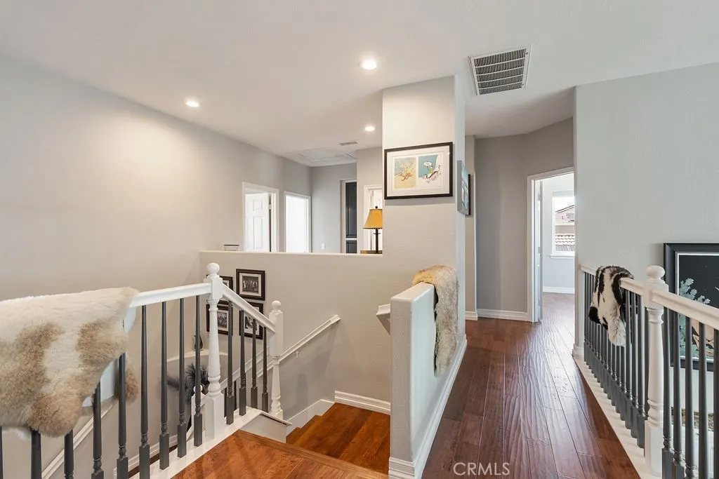Absolutely stunning property in highly sought after community of The Greens in Murrieta. This 5 bedroom pool home is a MUST SEE! From the moment you enter the home, you are welcomed by a formal living room space that is currently used as an office and a formal dining room. The heart of the home is where the kitchen and family room meet with soaring ceilings with loads of windows allowing all the natural sunlight to shine in. Gorgeous custom tile floors throughout the main floor. The gourmet kitchen has bright white cabinetry with underlighting, custom counters and backsplash, and stainless appliances. The first floor of this wonderful home boasts the Primary Suite with a fully remodeled custom primary bath and an additional secondary bedroom with private bath. There are three additional spacious bedrooms on the second floor, all with ceiling fans and wood flooring. The backyard is an entertainers paradise with a huge covered patio overlooking a sparkling in-ground pool and above ground spa. BBQ island is there for all of your culinary delights. All of this along with a list of upgrades: PAID solar with 3 batteries, upgraded windows, freshly painted deck, remodeled front landscaping, new water heater, new HVAC system, whole house fan, new vinyl fencing, fruit trees, new pool pump, new garage door opener with camera. Truly a dream come true.
