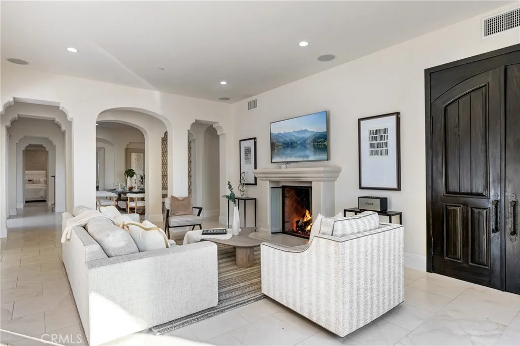 Welcome to this breathtaking luxury estate located in the exclusive, guard-gated enclave of Crystal Cove in Newport Coast. Perched high above the Pacific, this extraordinary residence offers panoramic ocean, canyon, and coastline views that create a truly serene and private retreat. This custom-designed masterpiece blends timeless Mediterranean elegance with contemporary sophistication. From the moment you arrive, you're greeted by exquisite curb appeal: rustic stone accents, terracotta rooflines, and a peaceful, tree-lined driveway that sets the tone for the home's serene and elevated ambiance. A gracious arched entryway leads into a luminous foyer and tranquil interior courtyard, framed by architectural columns and punctuated by a sculptural water feature a design centerpiece that blurs the line between indoor and outdoor living. The heart of the home is a light-filled great room, seamlessly flowing into the gourmet kitchen and dining spaces. A dramatic arched window showcases panoramic coastline views, while the open-concept floor plan is anchored by high ceilings, honed limestone flooring, and custom wood detailing throughout. The chefs kitchen is outfitted with premium Sub-Zero appliances, an oversized island with waterfall-edge countertop, and an artful tile backsplash. The adjacent formal dining room offers two sets of French doors to the courtyard and a stunning custom geometric feature wall ideal for entertaining in any season. This home features 4 bedrooms and 3.5 bathrooms, including two main-level bedrooms one of which serves as a second primary suite or priv