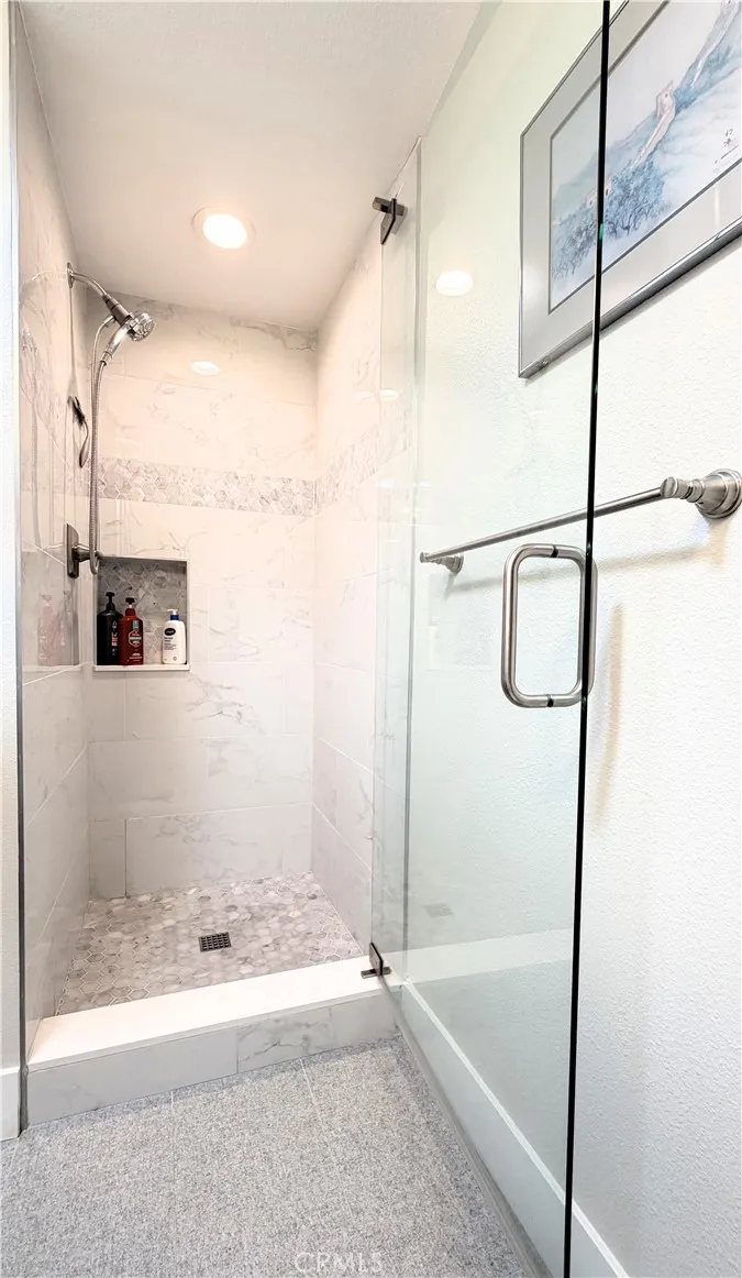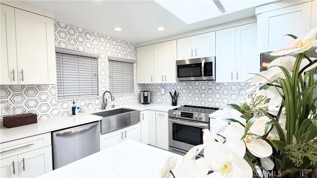 SOPHISTICATED MODERNIZED PRIVATE END-UNIT WITH A VIEW, offering the rare advantage of NO STAIRS AND NO ONE ABOVE, is situated in Laguna Woods, South Orange Countys most coveted 55+ community. NO EXPENSE WAS SPARED in this elegant transformation of the popular Casa Del Mar floor plan. This premier residence features seamless accessibility, private in-home laundry, all double pane windows throughout, and the convenience of covered carport. Nestled in the highly sought-after Phase 3 behind Gate 7, this condo provides a quiet sanctuary within walking distance to local shopping, dining, tennis, and golf, and is fully equipped with central air conditioning and heating. The interior is bathed in natural light, courtesy of dual skylights and solar tubes that create a bright, airy ambiance throughout. This modern residence showcases designer waterproof flooring and high-end porcelain tile in both bathrooms. The gourmet kitchen with professional-grade quartz counters complemented by a walk-in shelved pantry for ultimate storage , plus premium stainless steel appliances, and custom modern cabinetry. The living room serves as a striking focal point, featuring a custom built-in entertainment center with an integrated electric fireplace, architectural shelving, and professional pre-wiring for a seamless media experience. The primary suite is a true retreat, offering an expansive walk-in closet and a spa-inspired bathroom with a large executive shower. Beyond the abundant recessed lighting and refined finishes, the home extends to a private, enclosed patio with elegant porcelain tiling ov