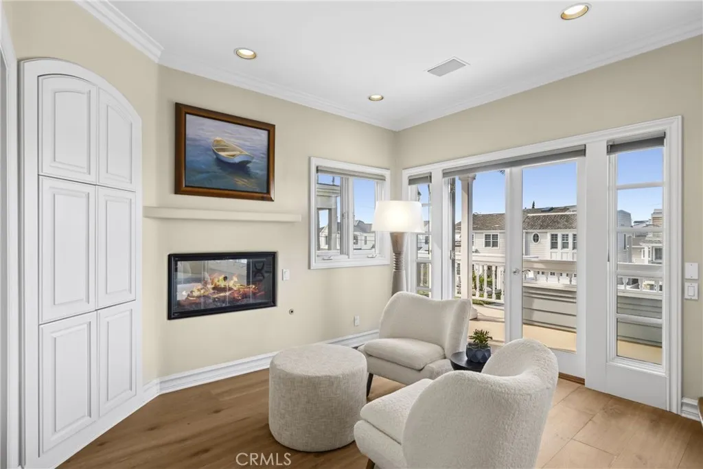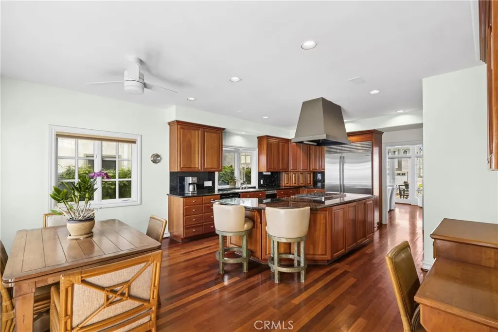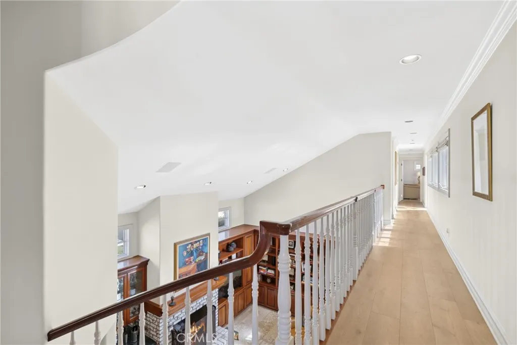 Set on an expansive 45 foot wide lot at the highest point of the street, this exceptional coastal residence captures sweeping ocean views and effortless indoor-outdoor living. A sprawling brick front patio serves as a quintessential seaside welcome framed by ocean vistas and seamlessly connected to the living room and formal dining room through walls of glass. Inside, the living room showcases coffered ceilings, a statement fireplace with classic mantel, custom built-ins. Thoughtfully appointed, the entertainer's kitchen supplies a Wolf oven, microwave, and six-burner range, reverse osmosis, granite countertops, a center island, appliance garage, walk-in pantry, and built-in desk. A sunlit breakfast nook is surrounded by windows overlooking the private backyard, complete with a built-in BBQ, outdoor shower, and spa plumbing, creating a natural extension of the homes entertaining spaces. The adjacent family room offers another fireplace, custom built-ins, and a wet bar, while a dedicated wine room accommodates 500+ bottles for the discerning collector and entertainer. Additional main-level amenities include a spacious powder room, a private ensuite bedroom with tub and shower, and a well equipped laundry room with sink and abundant storage. The three car garage features soaring ceilings and storage, while whole home conveniences such as central vacuum, hot water circulation, and dual A/C systems enhance everyday comfort. A dramatic spiral staircase rises to a central gallery hall, introducing the homes private bedroom level. The primary wing offers ocean views, a viewing bal