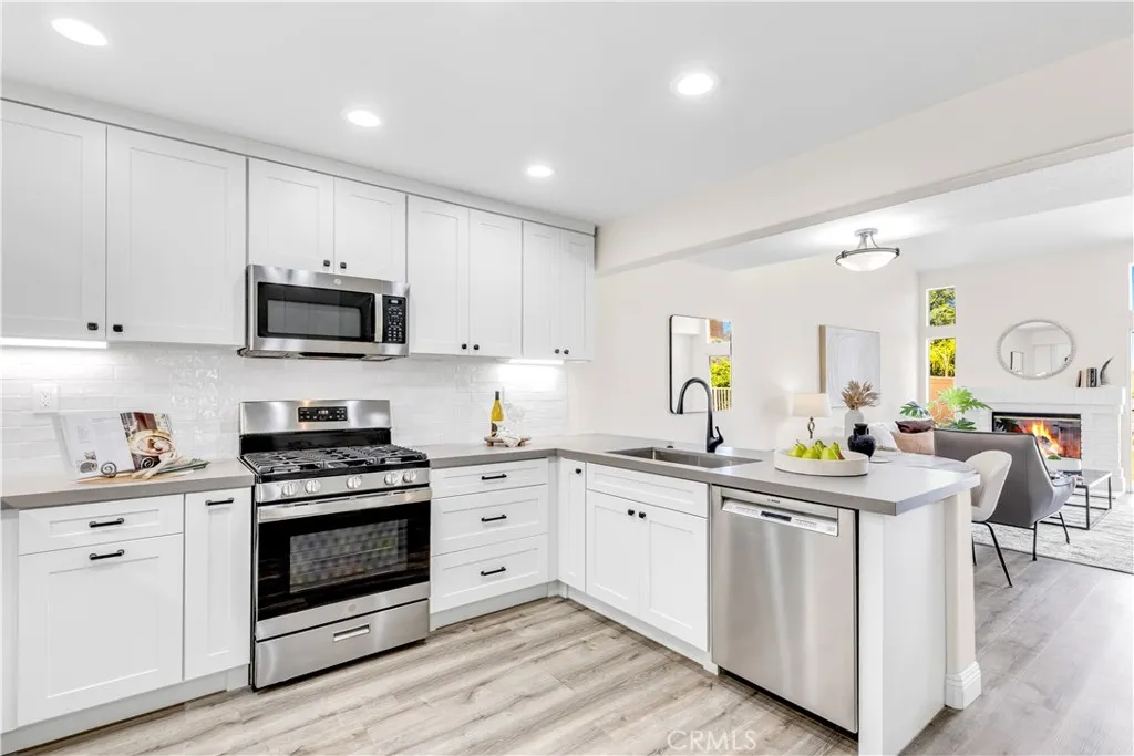 Located in the sought-after Tierra Linda community in the heart of Rancho Santa Margarita, this home offers beautiful hillside views and a highly functional 3 bedroom plus loft floor plan. The layout features one bedroom and full bathroom on the main level and two bedrooms and 2 full bathrooms upstairs, plus a spacious open loft / Flex space. Skylights in both the loft and primary suite bring in abundant natural light, enhancing the bright and airy feel throughout this beautiful home. The open floor plan offers welcoming living and dining spaces anchored by a gas fireplace. Details include sliding glass door leading to the back patio creating seamless indoor-outdoor living, LVP flooring, new carpet, fresh paint. The expanded and remodeled kitchen showcases new cabinetry with soft close features, quartz countertops, stainless steel farm sink, 5 burner gas stove and oven, recessed lighting, and an large eating nook. The downstairs bedroom also has sliding glass doors with direct access to the backyard patio, is perfect for a home office or guest bedroom and is adjacent to a full bathroom. Step outside to a large, sunny backyard with hillside views and enjoy the perfect weather Rancho Santa Margarita offers. The primary suite is generously sized and offers a comfortable retreat with a skylight, ceiling fan, a large walk-in closet and a ensuite bathroom showcasing dual vanities, new light fixture, wood cabinetry, and a frameless glass walk-in shower with a new door. The third bedroom offers panoramic hillside views and can easily accommodate a Queen sized bed. An oversized loft