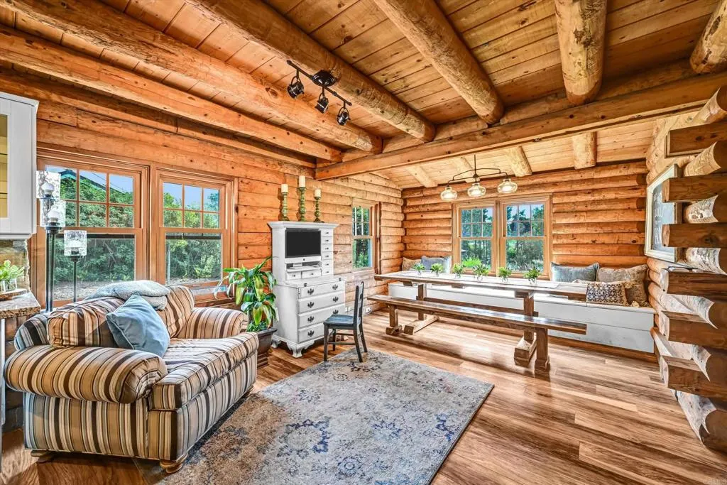 Escape to your own private retreat with this beautifully updated log home in Fallbrook. Spanning 2,445+ sq. ft., this secluded property offers a serene, mountain-lodge ambiance. The home features 3 bedrooms and 2 bathrooms with a versatile downstairs optional 4th bedroom or office. The open-concept layout centers around a welcoming family kitchen, perfect for gathering. Step outside to enjoy the scenic grounds complete with a pool, covered patio, numerous producing fruit trees, and sports court-ideal for entertaining or relaxing. Large covered patio creates a versatile outdoor living area, perfect for entertaining, dining or enjoying peaceful mornings and evenings. The detached two-car garage features a second story enclosed loft, with full bathroom, currently utilized for guests. Solar is leased currently for $162 per month with a 1.9% annual increase.