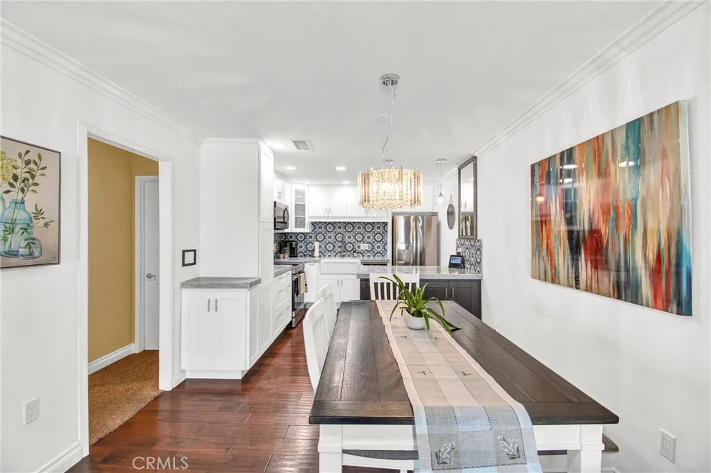 WHEN ONLY THE BEST WILL DO! This end unit, 2 bedroom, 2 remodeled baths, Ventura model, shows like a model. Beautiful, large living room & dining room with crown moldings to Accent the smooth ceilings. Dual pane windows, indirect lighting throughout and hardwood floors. TOTALLY REDESIGNED KITCHEN! Every conceivable upgrade! Stainless steel appliances, quartz countertops with a dynamic backsplash! pendant lighting! And much more! sliding glass door opens to the large patio with newer tile flooring & an awning for shade. Relax & enjoy entertaining & relaxing. This is an end unit with none above or below. Central Air Conditioning & full sized wash dryer closet. Laguna Woods offers a 27 hole golf course with a beautiful restaurant to enjoy! Driving range, tennis courts, pickleball courts, volleyball, 2 fitness centers, lawn bowling, equestrian center, library, state of the art theater, 5 pools & over 200 clubs! hurry, this one won't last
