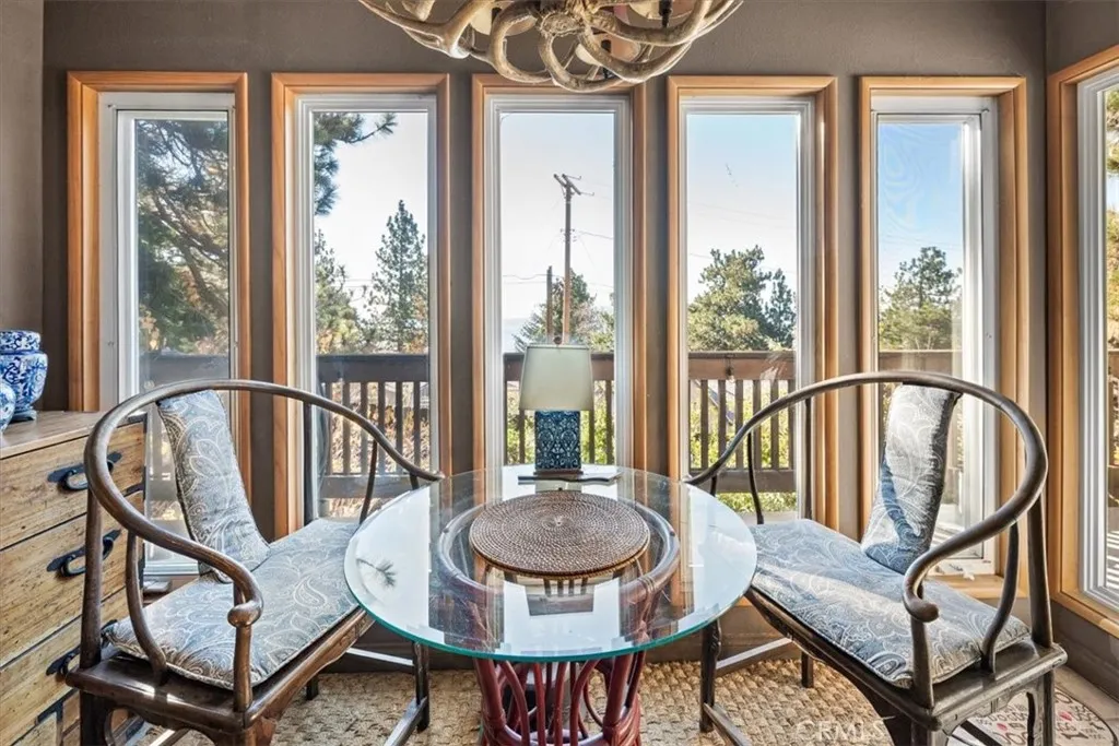 Welcome to this Charming Mountain TURNKEY Retreat, offering a Private Yard, Scenic Views from Two Decks, and the rare benefit of only One Neighboring Property. This well-designed SINGLE-LEVEL HOME features 1,886 sq. ft., 3 Bedrooms, 2 Bathrooms, a 7,280 SQ FTY Lot, and a 2-Car Garage. Step inside to an Open Floor Plan highlighted by a Spacious Living Room with a Fireplace, Custom Mantel, and Large Windows that frame beautiful mountain views. The Kitchen is thoughtfully appointed with Stainless Steel Appliances, Updated Cabinetry, Tile Countertops, and a separate Breakfast Nook with views. Adjacent to the kitchen is a Formal Dining Roomideal for gatherings and entertaining. The Primary Bedroom Suite is privately situated away from the other bedrooms and offers Direct Access to a Secluded Patio surrounded by mature trees. The Remodeled En-Suite Bathroom features Double Sinks and a Custom Tub and Walk-in Shower. A Second Bedroom includes Direct Deck Access and is tastefully finished with Custom Window Coverings and a Ceiling Fan. The Third Bedroom is currently used as an office and includes Built-In Cabinets and Shelving for Storage. The Centrally Located guest Bathroom has also been beautifully Remodeled and includes a Walk-In Shower. Additional features include Wood Ceilings, Stone Flooring, Newer Carpet, Updated Windows, Custom Paint, and Seagrass Wallpaper. Ideally located in Running Springs, this home is just minutes from local shops, restaurants, hiking trails, and Snow Valley Mountain Resort. Whether youre seeking a vacation getaway, rental opportunity, or full-time mou