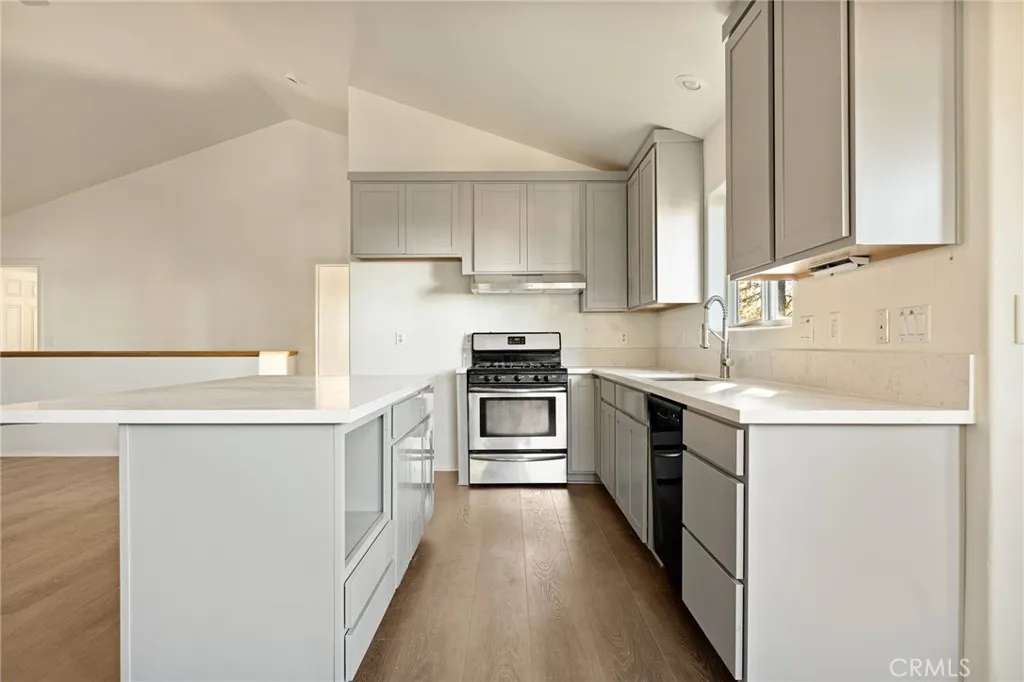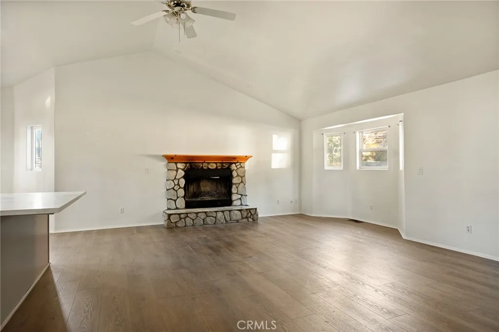 Level entry 3 bedroom 2 bathroom home in the heart of Running Springs. Seller has recently installed vinyl flooring and completely remodeled kitchen with new Quartz countertops and new cabinets for buyer. Step in to the living room to find vaulted ceilings and a river rock fireplace as well as access to outside deck with peekaboo views of the valley below. The main floor also has 2 bedrooms and a full bathroom. Down the stairs is the primary bedroom with spacious walk in closet, bathroom and another bonus room, workshop/storage area and closet for washer and dryer. Fully fenced yard and outdoor usable space for furry friends, outdoor play AND additional driveway to access side yard! Functional and inviting floor plan ensures comfort for every day living or weekend getaways!