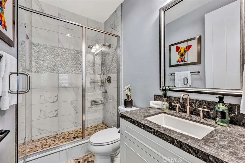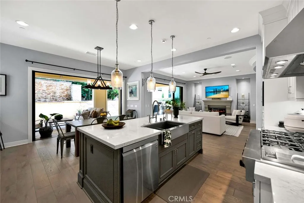 Modern design, privacy, and seamless indoor-outdoor living come together in this beautifully upgraded home in the highly sought-after Baker Ranch community. Ideally located directly across from a neighborhood park, the home pairs timeless architecture with refined finishes and thoughtfully designed living spaces. A private gated courtyard and elegant exterior create a welcoming first impression. Inside, wide-plank wood flooring, soaring ceilings, recessed lighting, and expansive windows fill the home with natural light. The open-concept main level is designed for both everyday living and entertaining, centered around a spacious great room with a fireplace and large sliding glass doors that connect the interior to the outdoor living space. The chefs kitchen is both stylish and functional, featuring custom cabinetry, quartz countertops, a full backsplash, premium stainless steel appliances, and a large center island with seating. Outdoor living is elevated with a covered California room, built-in BBQ area, fireplace, and private entertaining space, creating the perfect setting for relaxing evenings or weekend gatherings. Upstairs, a spacious loft provides a versatile second living area ideal for a media room, office, or play space. The master suite offers a peaceful retreat with a spa-inspired bathroom featuring dual vanities, a large walk-in shower, and a generous walk-in closet. The other two bedrooms are also incredibly spacious. There is a downstairs bedroom & full bathroom as well. In Baker Ranch, residents enjoy five pools, a swim club, 11 parks, sports courts, and mile