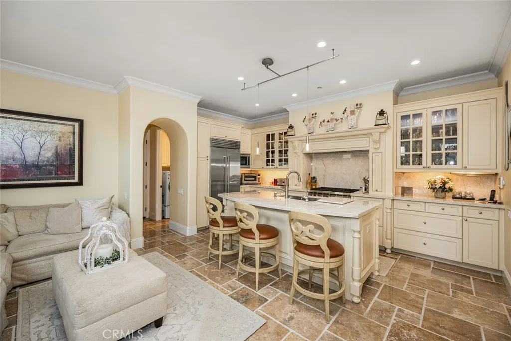 Located in sought-after Newport Heights, this luxurious Tuscan-style townhome offers an exceptional blend of elegance, warmth, and upscale coastal living. From the gated garden entry to the beautiful Mediterranean exterior, the home makes an immediate impression with timeless architectural character and manicured surroundings. Inside, a spacious floor plan unfolds with stone flooring, arched openings, recessed lighting, crown molding, and a stunning wrought iron staircase that anchors the interior with dramatic style. The formal living area features a beautiful stone fireplace, custom niches, and abundant natural light, flowing seamlessly into the dining space and gourmet kitchen. Designed for both entertaining and everyday living, the kitchen showcases expansive stone counters, custom cabinetry, glass display uppers, a large center island with bar seating, pendant lighting, and premium stainless steel appliances, including a professional-style range. An adjoining family room provides additional lounge space and comfort. Upstairs, spacious bedrooms and a versatile loft-style area are complemented by a serene primary suite with plantation shutters and a spa-inspired bath featuring a soaking tub, dual vanities, and stone shower. Rich finishes, custom detailing, and thoughtfully designed living spaces carry throughout the home, while the exterior offers classic tile rooflines, lush greenery, and inviting outdoor charm. Just moments from premier shopping, dining, beaches, and freeway access, this Newport Heights residence delivers sophisticated living in one of Newport Beachs m