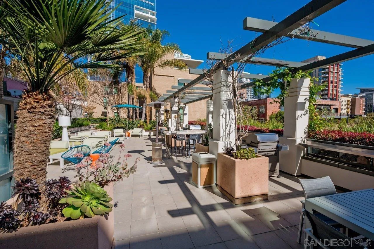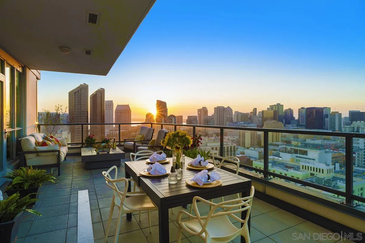The epitome of Downtown living! Footsteps to the convention center, Gaslamp Quarter, restaurants, and Petco Park is realized in this extraordinary northwest corner penthouse residence on the 21st floor of The Legend with a nearly 400 SQ FT ROOFTOP TERRACE! Stunning views span to the bay, ocean, and city skyline. Boasting a highly desirable floor plan with 2 separated bedrooms for enhanced privacy. 2 side-by-side parking spaces plus a motorcycle space (owners have parked 3 cars in the spaces), 1 storage room and 1 storage cage! Complete with recently installed wood floors, upgraded lighting, ceiling fans, pre-wired for surround sound, and a stainless/granite kitchen with Sub-Zero refrigerator, you will love where you live. Quite possibly the best unit in the entire building with the combination of the views and roof deck – enjoy Petco Park events from ‘Club Legend’ but then retreat to the quietest corner of the building for some rest and relaxation!