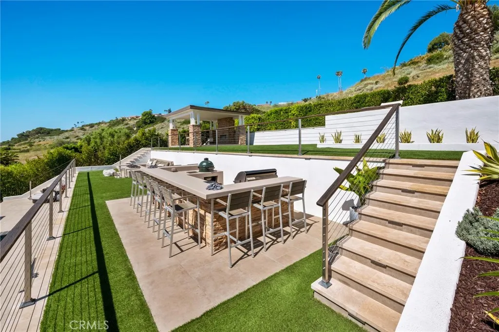 Perched in a prime coastal enclave of Rancho Palos Verdes, this Spanish-style residence captures sweeping ocean and Catalina Island views while offering an incredible indoor-outdoor lifestyle just moments from scenic trails, shopping, and all that Palos Verdes has to offer. The main level is designed for both everyday living and entertaining, featuring a living room, family room, and formal dining room, along with a separate dining area off the kitchen, plus a powder room for convenience. The family room opens to a private balcony with stunning ocean views, creating the perfect spot to relax and take in the scenery. The kitchen is equipped with Viking appliances, granite countertops, plentiful storage, and flows easily into the surrounding living spaces. The primary suite offers its own ocean-view balcony, a spacious walk-in closet, and a well-appointed bathroom with dual vanity sinks, a dedicated makeup vanity, soaking tub, and walk-in shower. On the lower level, three additional bedrooms are complemented by two full bathrooms, including one with dual sinks, along with a dedicated laundry room. The backyard has been completely reimagined into a true entertainers dream. Remodeled in 2025 and spanning three tiers, this resort-style setting features a view-facing jacuzzi, fire pit, outdoor bar and kitchen with grill and smoker, and a covered pavilion with fireplace. The side yard includes a thoughtfully designed pet area, conveniently located next to the trash bins for easy cleanup. New pavers, fresh landscaping, and artificial turf throughout the front, back, and side yards