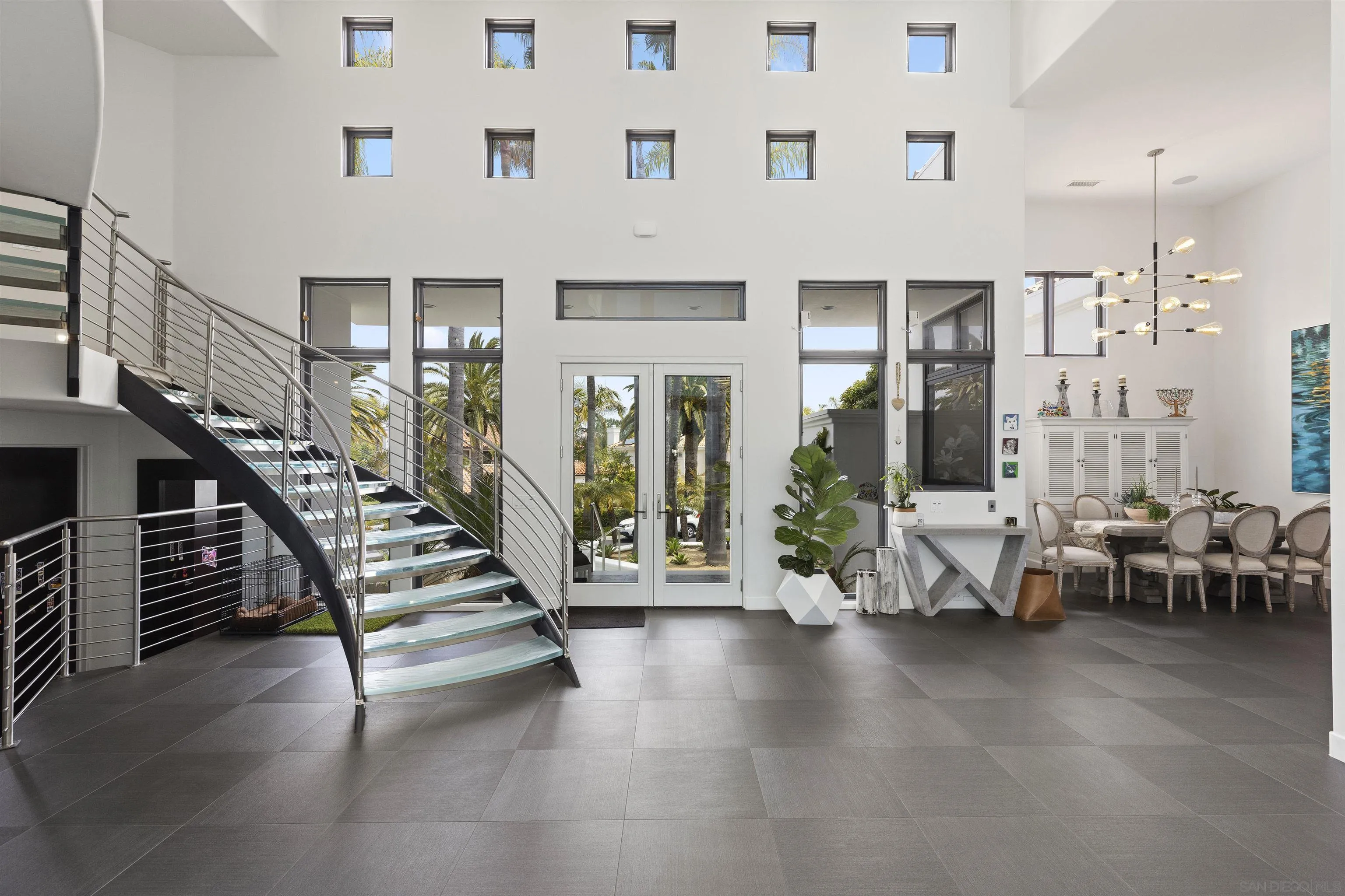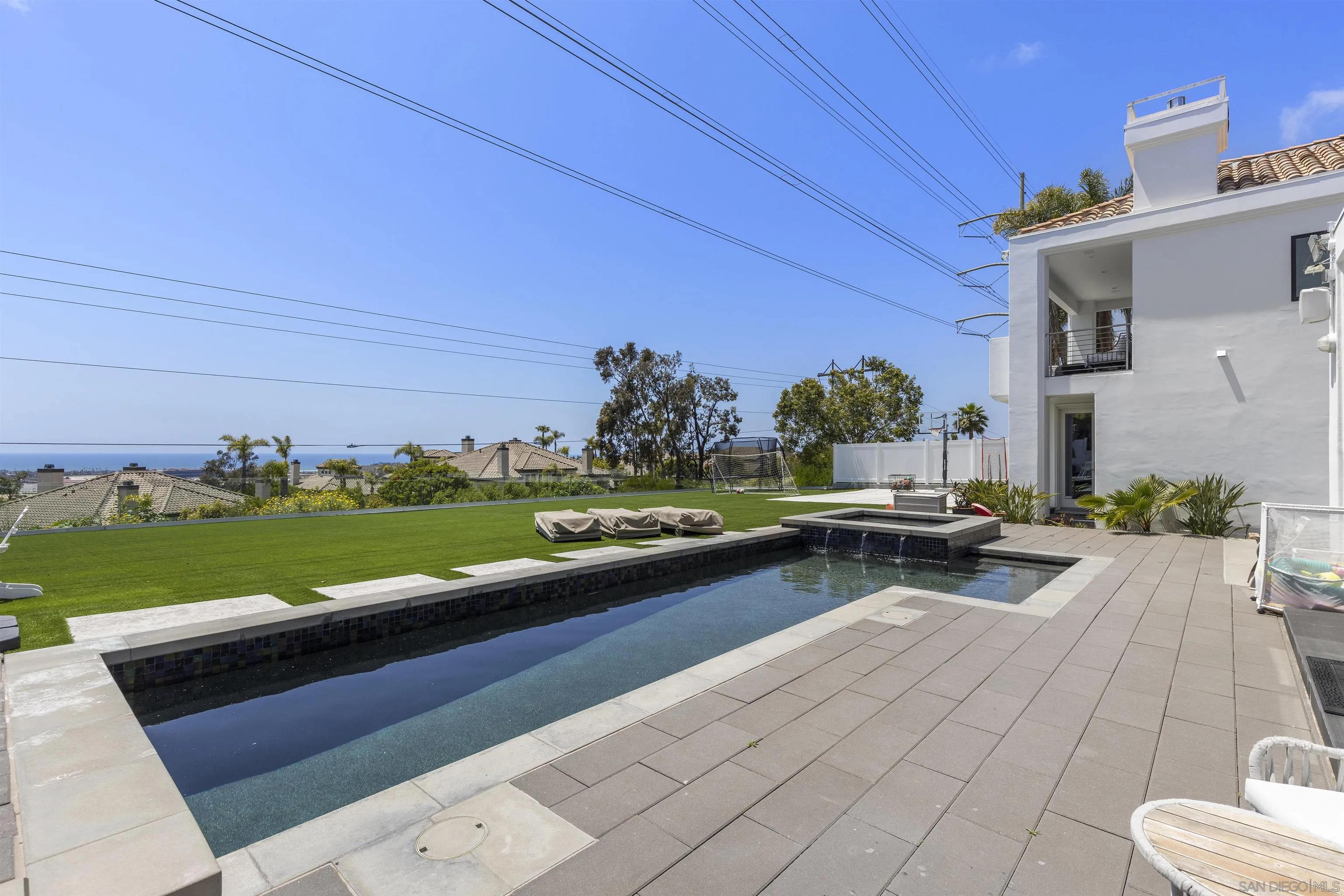 The SUNSET HOUSE is a design masterpiece. As you enter the home please don't let the designer one-of-a-kind stairs distract you from the spectacular views of the Pacific Ocean, the endless sunset colors, or the luxurious overall feeling to the house. This contemporary two-story elegant architectural home located above Flower Hill in the gated Rancho Del Mar Estates, comes complete with six bedrooms and six bathrooms, and is an entertainer's dream. As you walk into a light filled entry with a striking two-story wall of glass, a staircase welcomes you into 4,700 square feet. The abundant colors of sunset define this amazing home. They range from purple to white and yellow through orange and blue, sometimes all those colors at once, and together they linger over the Pacific until well into the evening, as stars assemble over the mountains a few miles away. While still close to everything, the peace and quiet of the secluded gated neighborhood will never be matched.