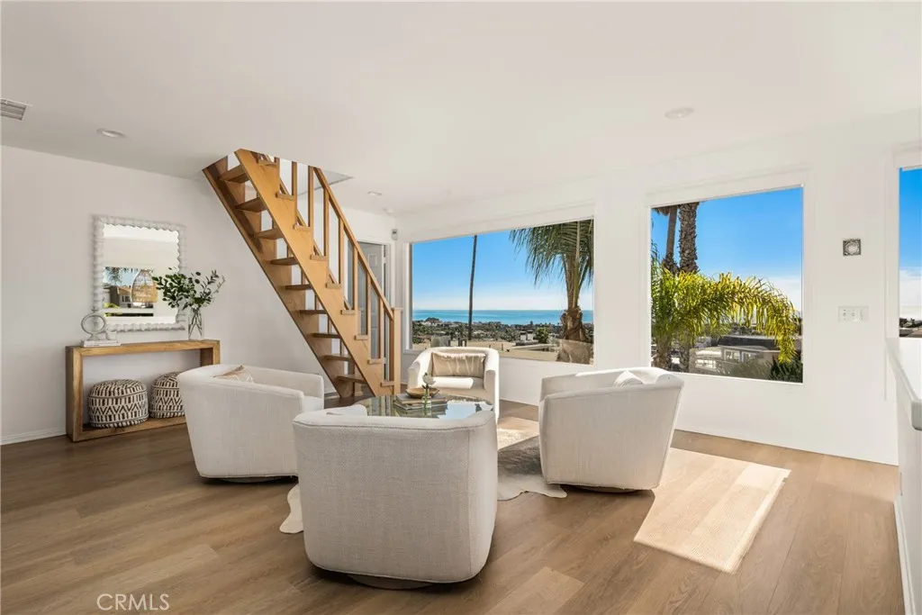 WHITEWATER OCEAN VIEWS visible from the kitchen, living areas, and primary suite. Unlike many homes in the Lantern Village, these views are unobstructed and panoramic and stretch all the way to San Diego and beyond. This modern coastal Mediterranean residence is bright, fresh, and refined, offering clean lines, a relaxed coastal vibe, and exceptional indooroutdoor living. Enjoy multiple outdoor spaces designed for both everyday living and entertaining, including a beautifully landscaped front yard framed by mature king palms, a spacious backyard ideal for gatherings, and a convenient outdoor shower; perfect after a surf session or beach day. An ocean-view balcony off the kitchen invites sunrise coffee moments. In addition, the expansive rooftop deck delivers breathtaking 360-degree ocean and mountain views, complete with an outdoor kitchen and gas fire pit. From here, take in Fourth of July fireworks from surrounding coastal cities, enjoy a front-row seat to the Dana Point fireworks, watch sailboats glide through the harbor, or soak in events like the Maritime Festival. Enter through a striking custom modern Mediterranean Dutch door, allowing ocean breezes to flow freely throughout the home. Inside, the property features numerous updates, including refreshed kitchen and bathroom plumbing and lighting fixtures, updated hard flooring throughout, recessed (canned) lighting, and a crisp white, light-filled interior. Additional highlights include electronic locks and en-suite bathrooms for all bedrooms, including two conveniently located on the main level. This home is ideally l