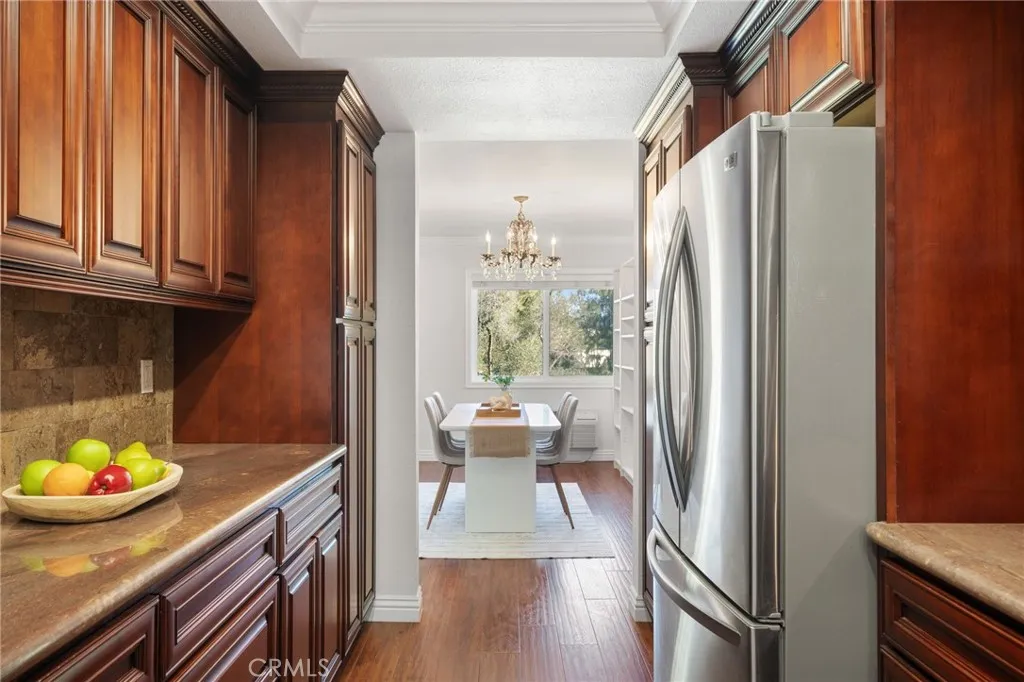 Welcome to this beautifully updated residence offering serene greenbelt views from both the living and dining areas, just a short walk from Clubhouse 5 and ideally positioned within the community. This sought-after Villa Nueva floor plan features 1 bedroom, 1.5 baths, no interior stairs (located in an elevator-served building), and a private entry. The spacious open-concept layout is finished with crown molding, recessed lighting, smooth ceilings, laminate wood flooring, and an impressive full wall of custom built-in shelving. The living area opens through a large sliding glass door to a covered balcony overlooking lush lawns and mature trees, an ideal retreat for enjoying peaceful mornings or relaxing evening breezes. The upgraded kitchen is both functional and stylish, showcasing custom cabinetry, granite countertops, a full-height tile backsplash, a tray ceiling with crown lighting, and stainless-steel appliances including a French-door refrigerator and dishwasher, offering excellent storage and workspace for everyday living and entertaining. The generously sized bedroom suite includes multiple closets and a dedicated dressing area complete with mirrored wardrobes and a built-in vanity. The primary bathroom has been tastefully remodeled with an oversized tiled walk-in shower and seating, while the guest half-bath provides a refined powder room for visitors. All windows and the sliding door are brand new, enhancing energy efficiency, comfort, and overall presentation. Additional upgrades include modern lighting throughout and a soft, neutral color palette. Convenient carp