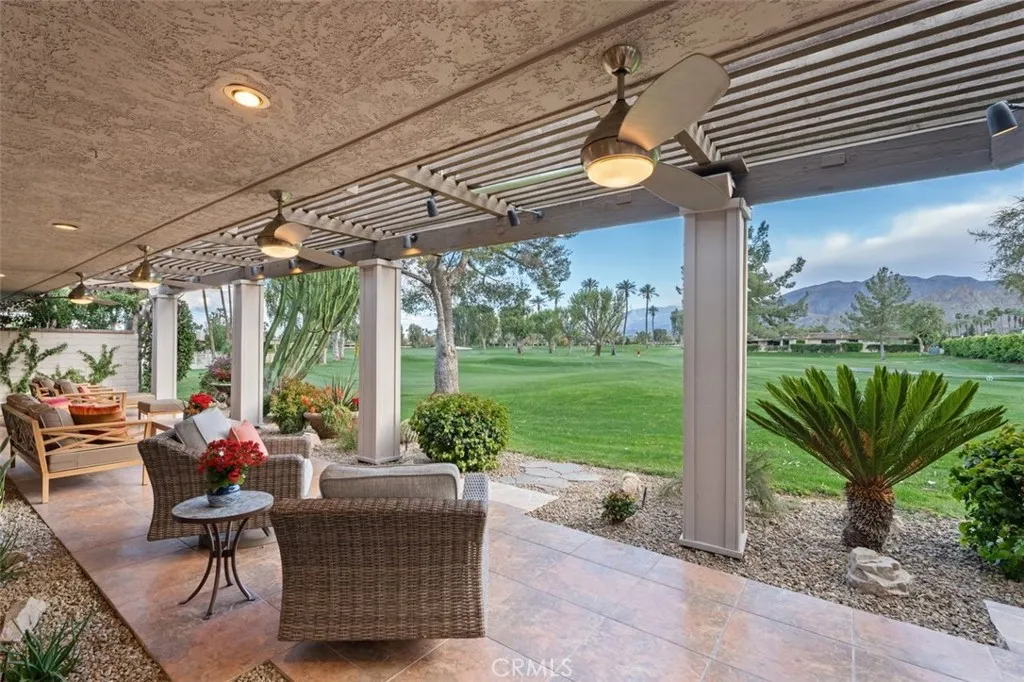 Welcome to your desert dream home in the heart of The Springs Country Club where luxury, lifestyle, and location come together seamlessly. Perfectly positioned on the prestigious 3rd hole of the championship golf course, this beautifully maintained 3-bedroom, 3-bath residence offers nearly 2,700 square feet of thoughtfully designed living space. With its coveted south-facing orientation, the home captures breathtaking mountain views and abundant natural light throughout the day. A large, tranquil private front courtyard welcomes you with a serene Koi pond, creating an inviting outdoor retreat ideal for morning coffee or evening gatherings. Inside, neutral stone flooring flows through the main living areas, complemented by new contemporary low-pile carpeting in the bedrooms for a fresh, modern feel. Designed for effortless indoor-outdoor living, the spacious layout opens toward the golf course and mountain backdrop. The primary suite is a true sanctuary, featuring two generous walk-in closets and a well-appointed en-suite bath. The kitchen combines style and functionality with slab granite countertops, a gas range, and stainless steel appliances perfect for both everyday living and entertaining. Additional highlights include a two-car garage plus a dedicated golf cart garage, both finished with durable epoxy flooring. Ideally located directly across from Eisenhower Medical Center and just minutes from shopping, dining, and entertainment at The River at Rancho Mirage and El Paseo, this home offers both privacy and convenience. Residents of The Springs Country Club enjoy a v