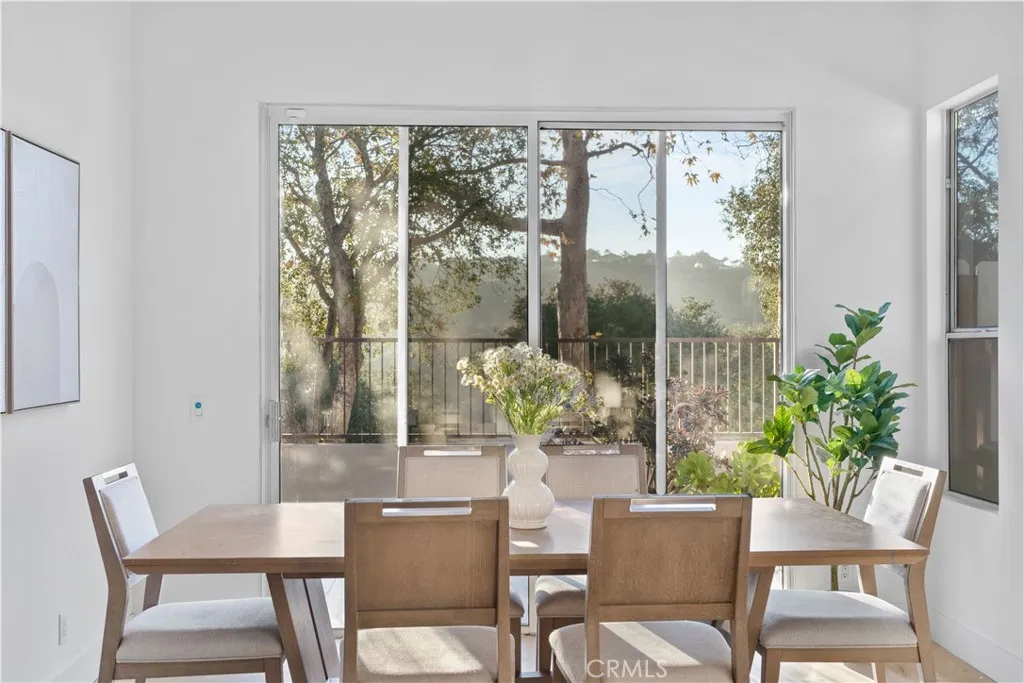Turnkey remodeled detached home in the highly sought-after Villavante community of Rancho Santa Margarita, located just moments from Tijeras Creek Golf Course. This light-filled residence offers approximately 1,712 sq ft with an open floor plan and beautiful hardwood flooring throughout the entry, living, and dining areas. The main level features a flexible office or ideal for guests, plus a convenient full bathroom with shower. The spacious kitchen includes quartz countertops, rich wood cabinetry, stainless steel appliances, and a bright breakfast nook. Upstairs, the oversized primary suite features a private patio deck, a large walk-in closet, and a spa-style bath with tub and separate shower. The secondary bedroom includes its own full bathroom for added privacy. Enjoy peaceful canyon views from the backyard with patio and low-maintenance artificial turf. Additional upgrades include fully paid solar, complete PEX re-pipe, and a garage with epoxy flooring and ample storage. Close to pools, spa, RSM Lake, parks, hiking trails, shopping, dining, tennis, and pickleball.