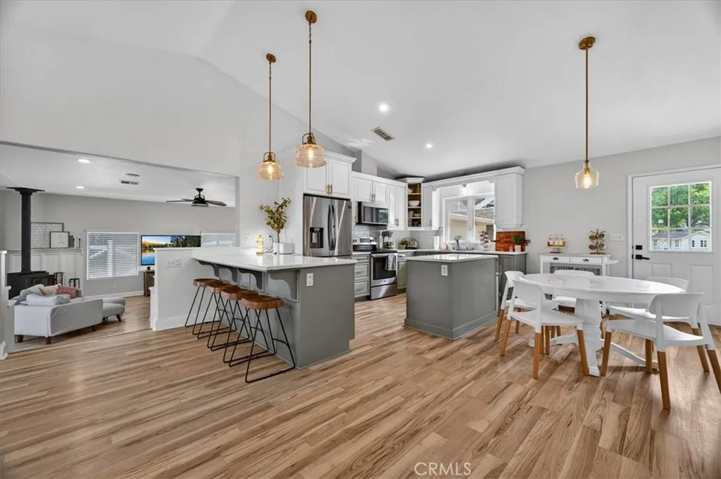 Welcome to this gorgeous updated 5 bed, 3 bath Auberry gem! This split level, Cape-cod style home adds a touch of architectural class to the area w/ it's absolutely stunning facade & an abundance of outdoor gathering space, outdoor fireplace, & plenty of parking space perfect for entertaining. Sitting on 4.7 acres, this property has a gated entrance. The sizable gathering space is set amidst carefully placed landscaping & cozy sitting areas under mature shade trees. Step up onto the front porch where the sunset views are absolutely breathtaking from the wrap around porch. Upon entering the front door, visitors discover high ceilings and an abundance of natural lighting throughout a clean, well-kept home. This area was added in 2008 and has central heating and air. The kitchen is open and elegant, with custom cabinetry, stainless appliances, & plenty of counter space. The adjacent hall pantry adds extra storage. Down the hall you'll find the main bedroom with 2 additional bedrooms. An exit door in the main bedroom allows access to the porch and courtyard for effortless indoor-outdoor living. The primary bath is large, with an oversized clawfoot tub perfect for soaking, as well as an enclosed shower. You won't have to wait for the hot water since the home is equipped with a newly installed hot water circulator. Cozy up in the living room by a newly installed EPA certified, wood burning stove that lights at the push of a button. This home gets the perfect amount of snow a few times each year, to make one feel they are in a Hallmark movie. Just past the living room you'll find