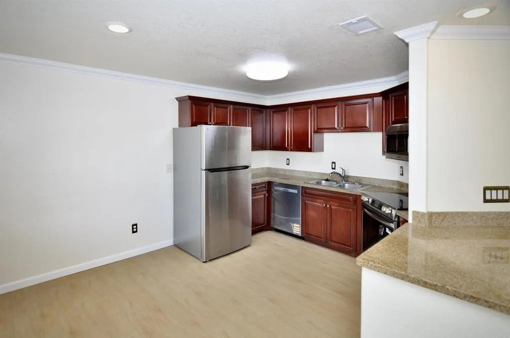 Ready for you to move in! Very well maintained condo has a beautiful, easy care, porcelain tile floor in wood plank pattern throughout. The kitchen features a new stainless steel frig, dishwasher and range. Stackable washer/dryer included. Energy efficient Milgard dual-pane windows only 5 years old. Bathroom features full bath/shower enclosure, sink, and flooring installed 2015. New light fixture and mirror 2026. Whole unit has fresh paint. New electric box installed with permit 2026. Water heater only 2 years old. Community features 2 pools w/spas, tennis court, fitness room, children's playground, dog run and clubhouse. Vista Way Village is a gated community in a prime location in Rancho Del Oro area. Easy access to 78 & 5. Just a few minutes from the beach. Unit sits in an excellent location in the complex with little to no noise. One car garage with storage cabinet and there is an extra designated parking spot just outside the unit.