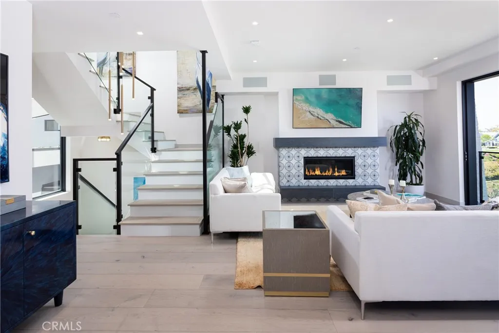 This newer built, modern masterpiece with a Private Elevator is located on a quiet street just blocks from China Cove Beach in the exclusive village of Corona Del Mar, Newport Beach. The Dramatic foyer features a floating glass staircase that compliments the high ceilings and open floor plan. A spacious living room with a contemporary glass fireplace and a balcony that provides stunning views of Begonia park & Fashion Island. The large open Chef's kitchen and dining room features Miele appliances, textured self closing doors and drawers, an oversized Quartz island with seating for 4 and and a large round dining table for 8, designer light fixtures, wide plank hardwood flooring and European hardware. Penthouse Master suite offers a well appointed master bedroom and an elegant ensuite master bath, with gorgeous stand alone soaking tub and a walk in shower. Lower level Arizona Indoor Great/Game room that opens to an expansive covered indoor/outdoor living room & kitchen complete with a large screen TV, glass fireplace, Foos ball, billiards, barbecue and sliding glass pocket doors ideal for those perfect California evenings. Private garage parking, 2 car tandem and front motor court for 2 cars. Smart home touches include Lutron lighting, electronic shade system, state of the art sound system, Nest thermostat system, keyless lock system and Ring doorbell camera. Also, there are 4 covered patio's to enjoy. Just minutes from John Wayne Airport, Fashion Island, World class golf, spa's and shopping. This jewel is the perfect getaway destination retreat.