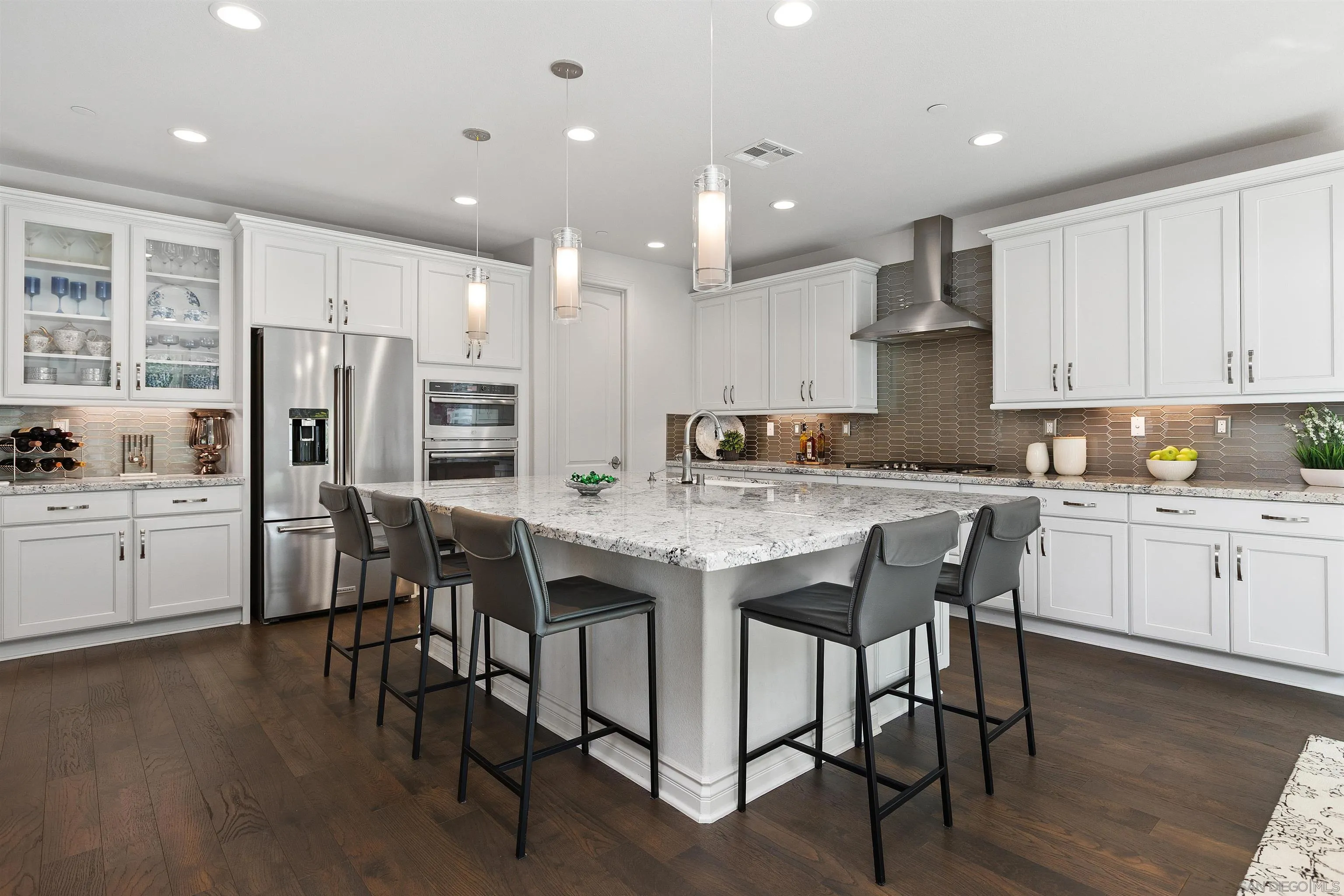 Welcome to this beautifully upgraded two-story residence located in the highly desirable community of Horse Creek Ridge. Tucked away on a quiet cul-de-sac, this 2020-built home offers approximately 3,719 sq. ft. of thoughtfully designed interior blending modern luxury, comfort, and energy efficiency throughout. This spacious 4-bedroom, 3.5-bath home includes a highly sought-after first-floor ensuite bedroom with a full bathroom, perfect for guests or multi-generational living. The home features soaring 9-foot ceilings, 8-foot doors, engineered wood flooring on the first floor, and an open-concept layout centered around a stunning great room with fireplace. Stacked bifold doors extend the living space seamlessly to the California room, creating an ideal indoor-outdoor entertaining experience. The chef’s kitchen is designed for both elegance and function, showcasing a large center island with granite slab countertops and seating for up to seven. Additional features include GE Profile stainless steel appliances, a 5-burner gas cooktop, built-in oven, microwave, dishwasher with front controls, porcelain kitchen sink, birch cabinets, full designer backsplash, under-cabinet lighting, recessed lighting throughout, a spacious walk-in pantry, bright breakfast nook that leads to the backyard through center open doors . This space truly serves as the heart of the home. Upstairs, the primary suite offers a luxurious retreat highlighted by a massive 17’ x 16’ spa-inspired bathroom.The primary bath features a large walk-in shower with built-in bench, oversized soaking tub, dual vanity.