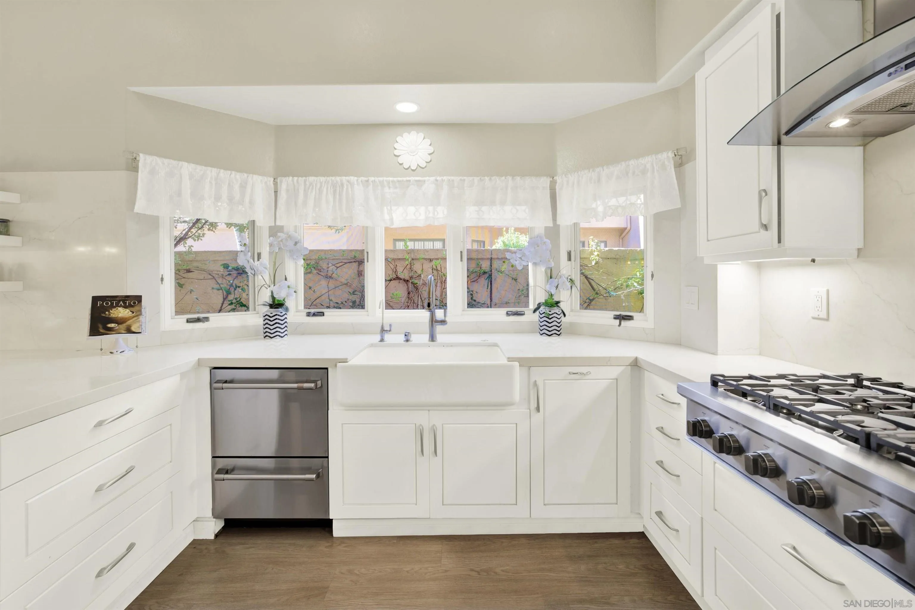 Located in the prestigious gated community of Alcala near the La Valle Coastal Club, this residence seamlessly blends luxury and comfort. The fully remodeled kitchen features a Fisher & Paykel 6-burner stovetop, custom backsplash, and farmhouse sink—perfect for culinary enthusiasts. This home is complemented by new flooring throughout, stylish ceiling fans, upgraded blinds, and striking custom chandeliers. Designed for versatility, the home offers two master bedrooms—one conveniently located on the main floor—each providing a private, spa-like escape. Two gas fireplaces add warmth and ambiance to the main living spaces. The finished garage includes a custom laundry area with built-in cabinets and sink, a tankless water heater, and generous storage. Residents enjoy access to a sparkling community pool, completing the coastal lifestyle. A rare find in a prime coastal location, this home delivers both refined elegance and everyday functionality.