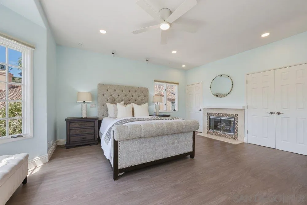 First showings begin Friday, April 3! EXTENSIVE RENOVATION completed Jan 2024. ROOF REPLACED in 2020. Set within the only guard-gated community in Rancho Santa Fe’s Whispering Palms neighborhood, this beautifully updated corner-unit, turn-key residence offers an open, light-filled floor plan. Sought-after dual primary layout w/ one primary suite on the main level. Upgrades include beautiful luxury vinyl flooring and a redesigned kitchen. The kitchen features new countertops, designer backsplash, Fisher & Paykel 6-burner cooktop, double convection oven, full-size refrigerator, under-counter beverage refrigerator, farmhouse sink & faucet, drinking water system, pantry & an open layout created by removing the pony wall. Three sets of French doors open to the side yard & backyard, creating seamless indoor-outdoor living. Additional upgrades include replacement of the original polybutylene piping, tankless water heater, recessed lighting w/ dimmers, updated lighting fixtures, baseboards, blinds, door hardware, ceiling fans, custom fireplace w/ mantel, built-in shelving, private courtyard entry gate, full-size washer & dryer, garage storage racks & cabinets, garage refrigerator, garage door spring & opener & fresh paint. Whisper-quiet private end-unit (and no one above or below) adjacent to the pool & spa w/ backyard gate access. Short stroll (or golf cart ride) to the newly renovated $38M Valle Coastal Club w/ golf, tennis, pickleball, swimming, fitness center, restaurant & bar. Just 3 miles to the Village of Rancho Santa Fe & 4 miles to the beautiful beaches of Del Mar.