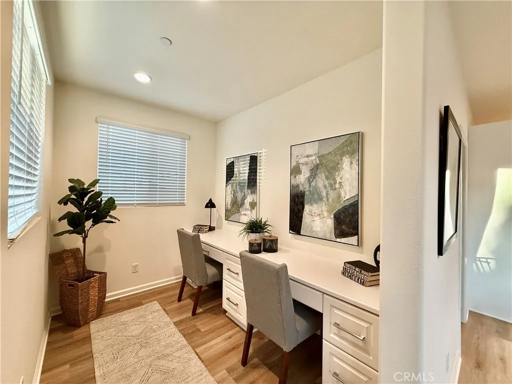 Dont miss this rare opportunity to own a highly upgraded, better-than-new 2023 Beazer home with paid-off solar and a luxuriously landscaped backyard, nestled in the desirable Boulder Creek communityjust minutes from Murrieta. This 2,599 sq ft single-story Chicory floor plan offers 4 bedrooms, 3 baths, a dedicated office with built-in desks, and a spacious 3-car tandem garage. Set on a premium cul-de-sac lot with single-story neighbors to the left and back, it offers enhanced privacy, curb appeal, and ample parking. The professionally landscaped backyard is an entertainer's dreamfeaturing a wide, wraparound colored stamped concrete patio, lush artificial turf, vibrant flowers and trees, automatic drip irrigation system, and breathtaking mountain views. Inside, high ceilings and luxury vinyl plank flooring flow throughout. The gourmet kitchen with granite countertops, Whirlpool stainless steel appliances, a large island that seats four people with pendant lighting, a Moen Spot Resist Stainless Sleek farm-style faucet, and a deep stainless sink. Cabinet upgrades include pull-out shelving and built-in dual trash/recycle bins. Spacious wrap-around pantry. The kitchen opens to an oversized great room with TV wall prep and a bright dining area with large sliding glass doors to the backyard. The primary suite retreat features a spa-style soaking tub, separate shower with clear glass enclosure, dual vanities, oversized walk-in closet, and linen storage. Three secondary bedrooms are thoughtfully positioned for privacy, and the second full bath includes double vanities in a separate r