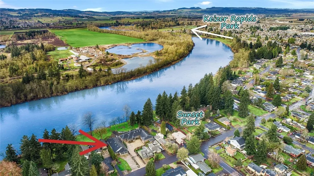RIVERFRONT PROPERTY! Positioned along a quiet stretch of the Willamette River, this Keizer property offers a rare combination of space, privacy, and connection to the outdoors. Set on over half an acre with DIRECT WATERFRONT ACCESS, the backyard feels expansive and secluded while remaining just minutes from town. The heated 3 bay Garage is approximately 1800 sq ft. The largest bay is 55 deep with a 12 tall door. A generous covered patio extends the living area outdoors ideal for entertaining or unwinding in a true Northwest setting. The long stamped concrete driveway offers abundant parking and leads to an oversized attached garage with exceptional flexibility. Near Keizer Rapids Park and Salems riverfront amenities, this is riverfront living with substance and presence. Built in 2010, the home provides nearly 3,000 square feet of well designed living space with wide 36 inch doorways and an accessible layout.