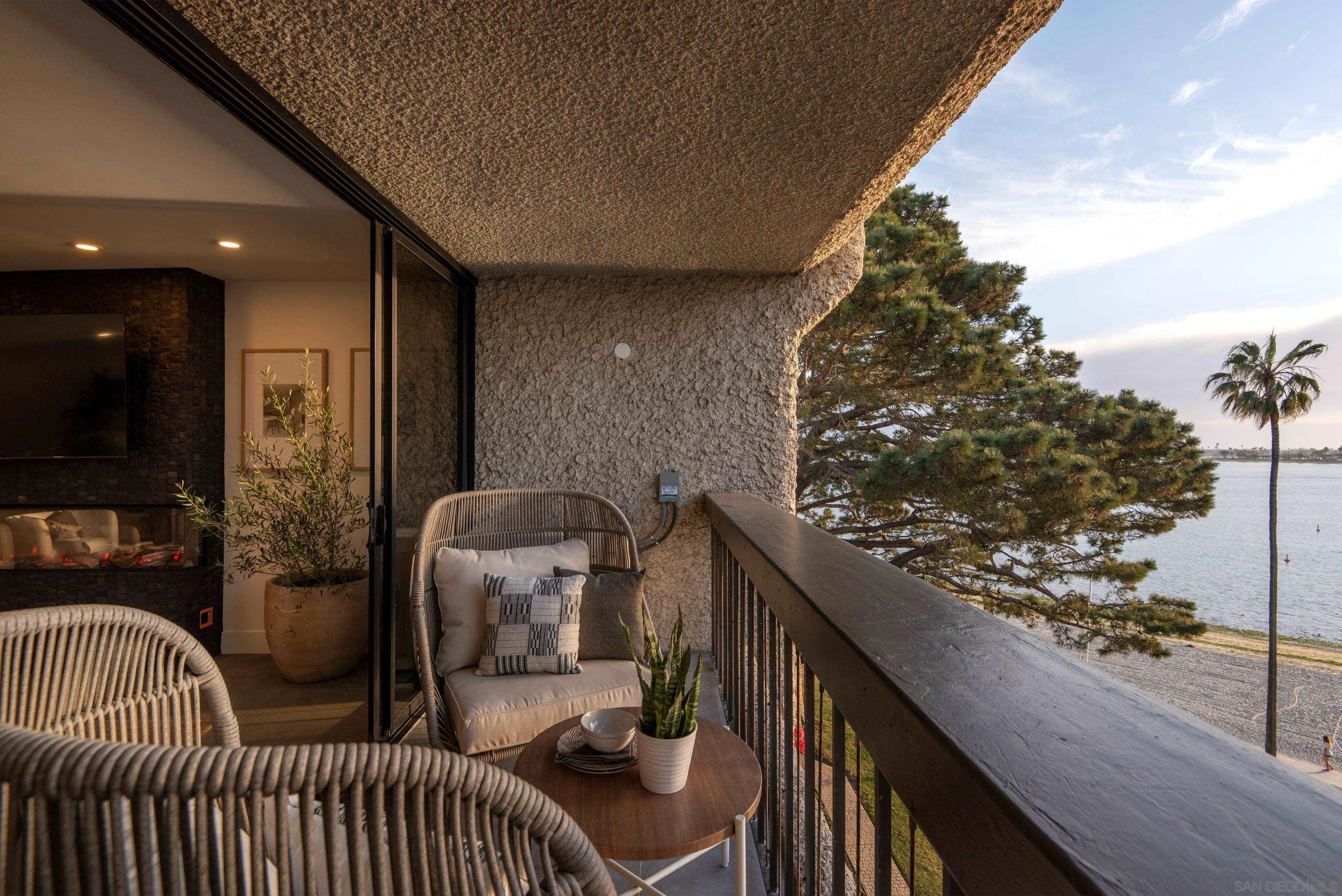 Perched on the top floor of Bay Scene directly on Sail Bay, this rare residence offers one of the most coveted view lines in the community — sweeping western-facing bay vistas with ocean views beyond. Spanning 1,559 square feet, this completely remodeled 2-bedroom, 2-bath home is the ultimate coastal retreat, blending sexy Hawaiian-inspired design with modern beachfront luxury. The open living space is anchored by a dramatic stone-clad fireplace and flows seamlessly into a show-stopping kitchen featuring brand-new contrasting black and warm wood-tone cabinetry, lava rock leather-finish countertops, and sleek black Café Series appliances. Designed for both entertaining and everyday living, the layout captures breathtaking sunsets and shimmering water views from nearly every room. The primary suite is a true sanctuary with a walk-in closet and a spa-inspired bathroom showcasing gorgeous tile work, a Restoration Hardware vanity, and West Elm lighting. The guest bathroom is equally refined with elevated finishes throughout. A dedicated laundry room and generous storage complete the home’s effortless functionality. Residents enjoy resort-style community amenities including a pool, spa, outdoor showers, barbecues, recreation room, and fitness room — perfect for relaxing, entertaining, and embracing the coastal lifestyle. Whether as a full-time residence or the perfect lock-and-leave second home, this home delivers an unparalleled Sail Bay lifestyle — where every day feels like a luxury beachfront getaway.