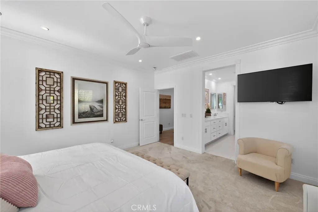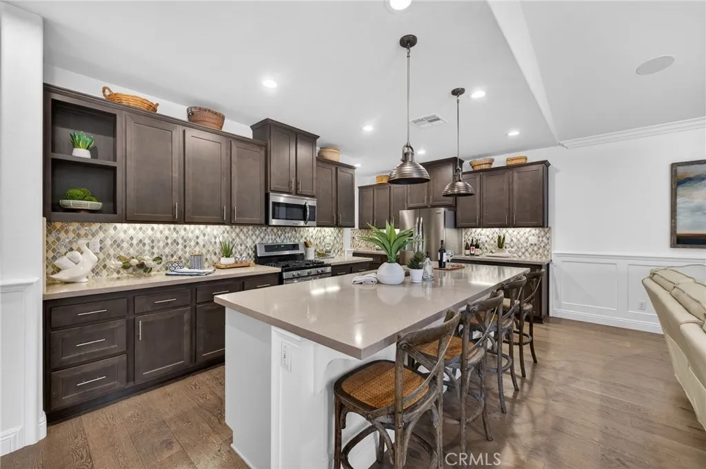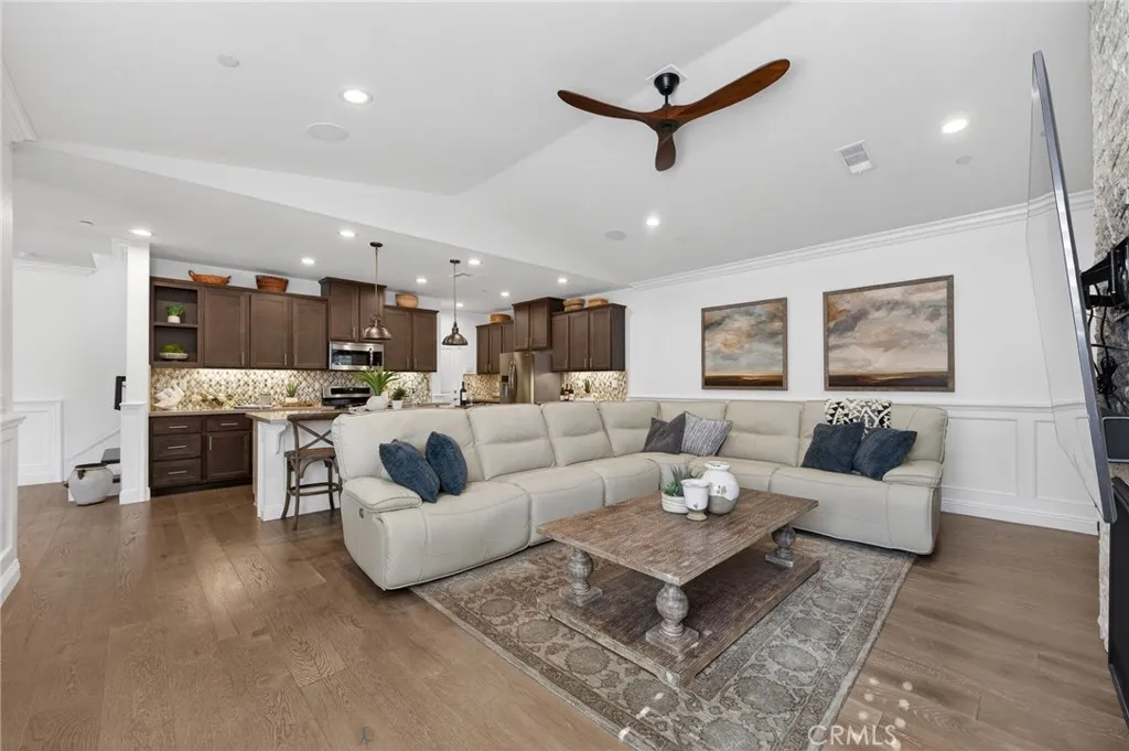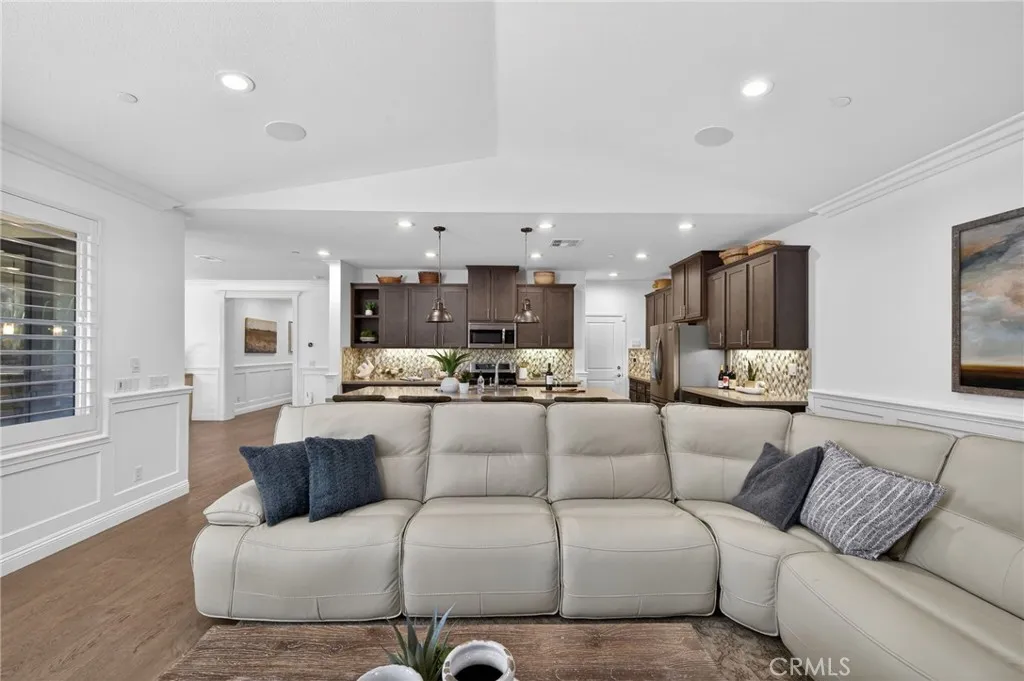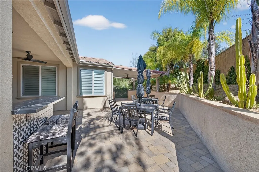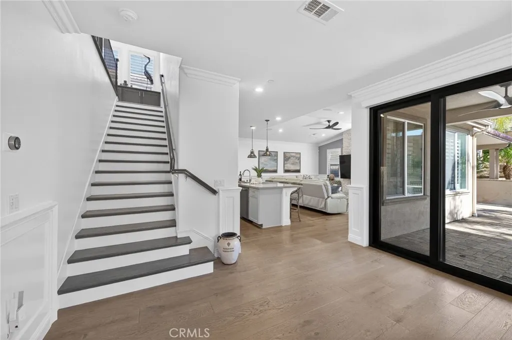 Welcome to this beautifully upgraded former model home, perfectly situated on a desirable corner lot featuring 4 bedrooms and 3 full bathrooms. Designed with style and functionality in mind, this home showcases premium finishes and thoughtful upgrades throughout such as crown molding, new sliders, plantation shutters, and ceiling fans in all the rooms. Step inside to discover a bright, open floor plan with designer touches, upgraded flooring, and elegant details that reflect its model home status. The spacious living areas flow seamlessly into the kitchen and dining spaces, creating an ideal layout for both everyday living and entertaining. The living room offers a surround sound system that is perfect for movie nights or enjoying your favorite music. One of the standout features is the convenient downstairs bedroom and full bathroom, perfect for guests, multigenerational living, or a private home office. Upstairs, youll find additional generously sized bedrooms and comfortable living space designed for relaxation. The primary suite offers plenty of natural light and a custom built closet. Enjoy energy efficiency with paid solar, helping keep utility costs low while living sustainably. Outside, the corner lot location provides added privacy and curb appeal, with extra outdoor space to relax, entertain, or design your dream backyard. The backyard is already equipped with a beautiful custom bar and covered patio with a ceiling fan. This exceptional home blends modern comfort, smart energy features, and designer upgradesall in one incredible package.