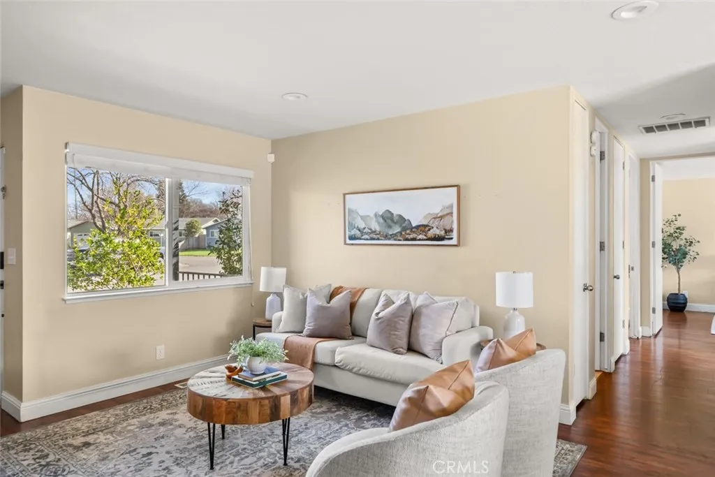 Located in a quiet neighborhood, this clean and move-in-ready 3-bedroom, 2-bath home is full of charm WITH A POOL! Step inside to a light-filled living room featuring rich hardwood flooring, recessed lighting, and a beautifully tiled wood-burning fireplace. The space flows seamlessly into the separate dining area, complete with a sliding glass door leading to the backyard and poolperfect for indoor-outdoor living. The kitchen offers granite countertops, a stone tile backsplash with warm mosaic tones, stainless steel appliances, a gas range, and ample storage in crisp white cabinetry. A cozy breakfast nook includes an additional sliding glass door opening to the patio beneath a charming white pergola. All three bedrooms feature hardwood floors and closets. One bedroom includes an en-suite bathroom with a walk-in shower, while the guest bathroom offers a convenient shower/tub combination. The fully fenced backyard is ideal for relaxing and entertaining, featuring an in-ground pool with safety fencing, a large concrete patio, lush green grass, and a mature English walnut tree providing generous shade. This true charmer is conveniently located near Pleasant Valley High School, Upper Park, shopping, In Motion Fitness, and offers easy freeway access. A wonderful opportunity to enjoy comfort, convenience, and classic appeal.