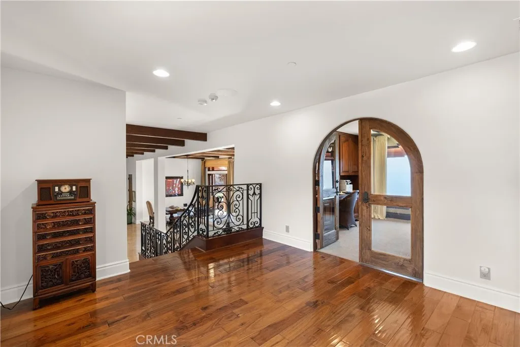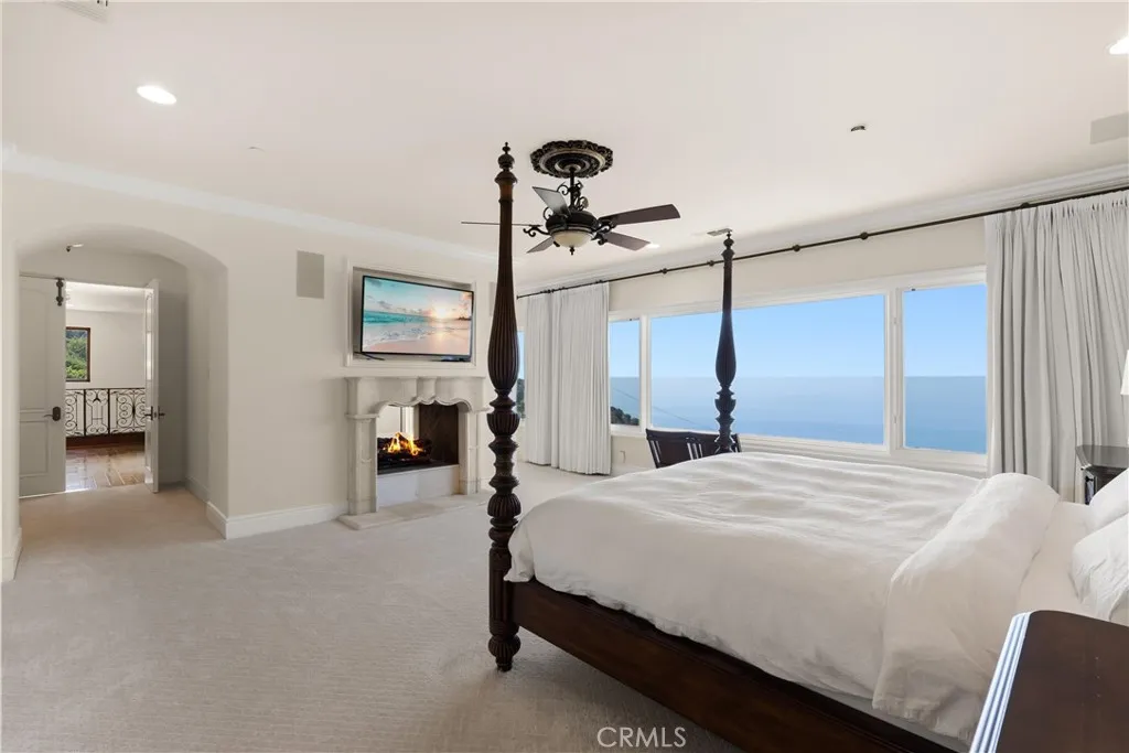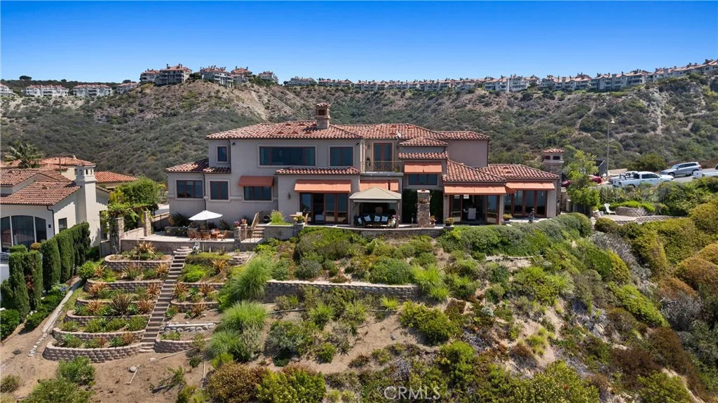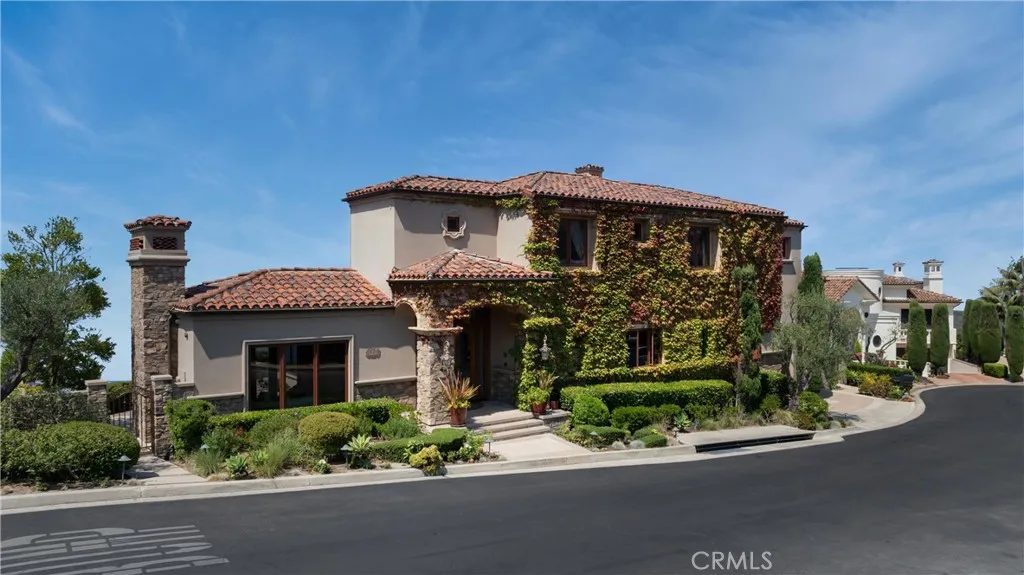 Nestled within a prestigious guard-gated community, this Mediterranean custom estate is perched on a scenic bluff, capturing sweeping, unobstructed views of the ocean, Catalina Island, and coastline from nearly every room. Thoughtfully designed with four bedrooms and a dedicated office, the residence features a sought-after main-level primary suite and ensuite baths in each bedroom, offering elevated comfort and privacy. Defined by timeless craftsmanship, the interiors blend rustic elegance with refined detailhighlighted by custom distressed wood beams, rich hardwoods, stone accents, and bespoke lighting throughout. French doors open to expansive viewing decks, creating a seamless connection to the coastal surroundings and inviting in ocean breezes. Tailored for both intimate gatherings and grand entertaining, the home offers a formal living room with stone fireplace, a sophisticated dining room, and a spacious great room that flows effortlessly into the chefs kitchen. Culinary enthusiasts will appreciate the Thermador gas range with grill, double ovens, dual warming drawers, Sub-Zero refrigerator, and additional refrigerated drawers. A walk-in pantry, butlers pantry, wet bar, and temperature-controlled wine room complete the entertainers experience. The outdoor living area offers a serene escape, enhanced by lush landscaping, a tranquil water feature, and a striking fireplace. This private retreat features the perfect backdrop for relaxed coastal living beneath the stars. All just moments from the renowned beaches, art galleries, and fine dining of Laguna Beach.