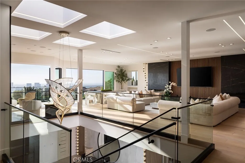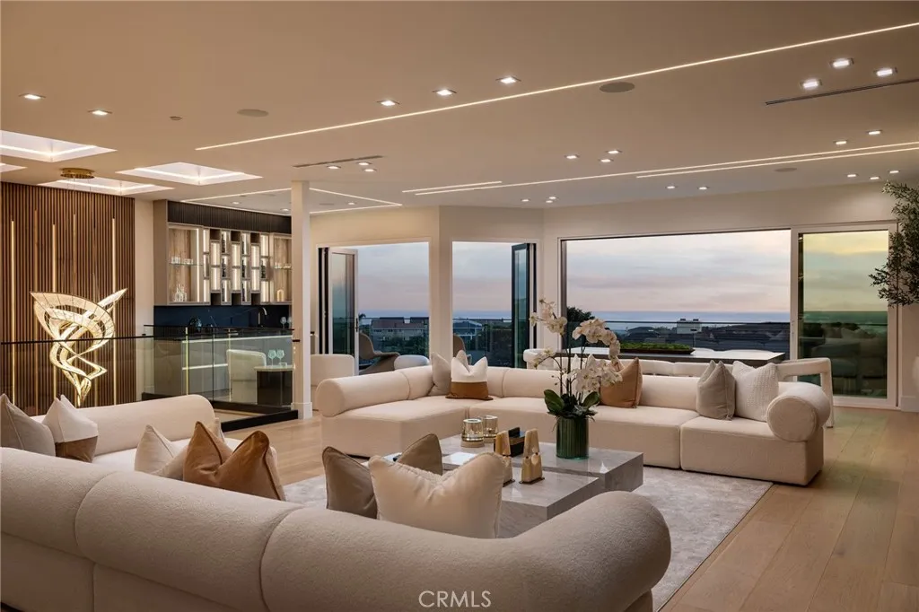 An extraordinary vantage point of ocean, harbor, island, and city lights defines this exceptional coastal estatewhere sweeping panoramas of the Pacific, Catalina Island, Newport Harbor, and the Los Angeles skyline become a daily backdrop. Set within the guard-gated community of Harbor Ridge, this newly transformed residence rests at the end of a quiet cul-de-sac, offering a rare sense of seclusion paired with architectural sophistication. A private entry gate and statement front door introduce interiors that are both striking and inviting, where clean-lined design meets warmth and livability. A private interior elevator provides effortless access between levels, enhancing both convenience and livability while complementing the homes thoughtful design. Expansive living spaces unfold with an emphasis on light, scale, and flow, seamlessly connecting to the outdoors. The main level hosts three well-appointed bedrooms, including a junior suite positioned to capture ocean views, while two additional bedrooms enjoy a tranquil setting alongside a custom water feature. A refined lounge with a fireplace, built-in bar, and media wall creates an intimate yet elevated space for gathering. Upstairs, the home is thoughtfully arranged to prioritize both privacy and experience. The primary suite is positioned to fully embrace the panoramic views, wrapped in glass and complemented by a spa-caliber bath and a custom, boutique-style dressing room. An additional bedroomcurrently utilized as a private office with its own balconyoffers flexibility without compromising the homes overall layout. Th