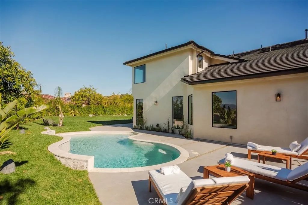 Welcome to 4016 San Remo Way, a statement estate nestled behind the exclusive 24-Hour Guard-Gated Silverhawk Ridge. Set on a commanding 17,743 sqft lot with sweeping views of the valley and Santa Monica Mountains, this newly reimagined residence is a masterclass in modern California luxury. A striking arrival sets the tone, where a custom oak front door and wood-clad garage hint at the level of craftsmanship and intention carried throughout the home. Inside, dramatic two-story vaulted ceilings and a sun-drenched open floor plan create an immediate sense of scale, volume, and effortless sophistication. Every detail has been carefully curated. Plastered interior walls, solid oak flooring, custom cabinetry, and bespoke lighting come together to create a warm yet refined palette. Expansive Fleetwood sliding doors and Lincoln windows dissolve the boundary between indoors and out, elevating the homes connection to its natural surroundings. Integrated speakers throughout the home allow music to flow seamlessly from room to room, enhancing the overall ambiance and lifestyle experience. The living spaces are both grand and inviting, offering a formal living room, an elegant dining area, and a stunning family room - all seamlessly connected to a showpiece kitchen with marble countertops and premium finishes, designed for everyday living and elevated entertaining. The primary suite is a true retreat, privately positioned to capture breathtaking views across the valley and into the Santa Monica Mountains. A private balcony extends the space outdoors, while a generous walk-in closet and