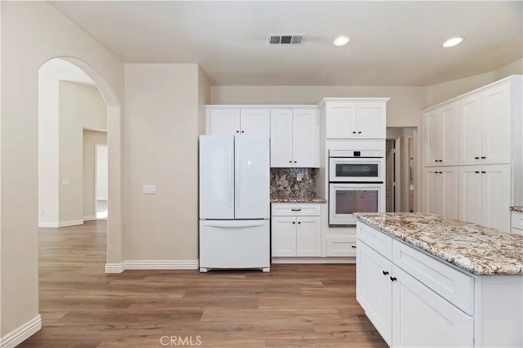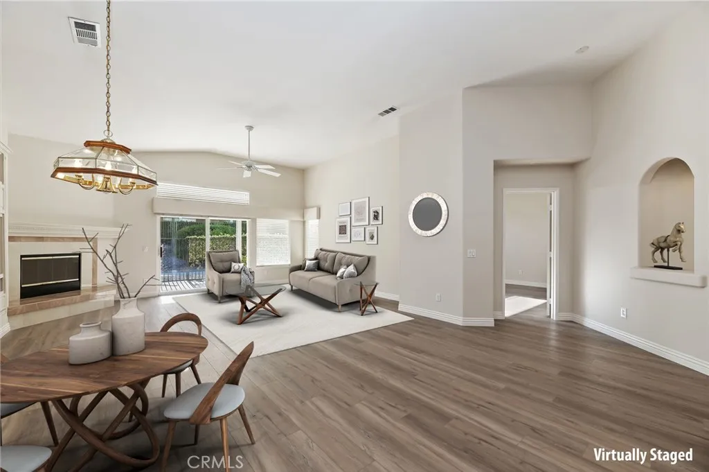 BEAUTIFUL SINGLE-STORY HOME in The Colony Premier 55+ Community! Interior recently updated to include brand new stylish LVP flooring throughout, upgraded baseboards, neutral interior paint & so much more. From the moment you step inside, wonderful vaulted ceilings & an abundance of natural light fills the open-concept living spaces. You will love the chefs kitchen, a true showpiece, enhanced with new cabinetry, elegant granite countertops, a large center island, rich finishes & a bright eat-in nook. The inviting great room features a formal dining area & spacious living room with fireplace ~ perfect for both relaxing evenings and entertaining guests. Primary suite is complete with high ceilings & California-style walk-in closet. The updated bath has dual sinks, a soaking tub, & a separate walk-in shower with rimless doors. New cabinetry adds a fresh, refined touch. Two additional bedrooms, situated near their own bathroom are ideal for guests, hobbies, or a home office. The indoor laundry room features new cabinetry with granite counter top, a utility sink & plenty of storage. Step out to your east facing patio which is perfect for morning coffee or evening relaxation with space behind you to give privacy from neighbors. The charming entry courtyard creates a warm and welcoming first impression with fresh plants. The garage offers built-in storage cabinets + a large storage alcove ideal for projects & organization. This home combines comfort, style & a great location in a vibrant community offering resort-style amenities. The Colony is a premier gated senior community for