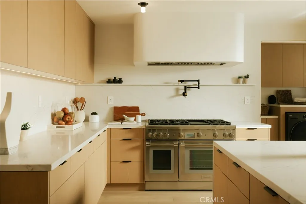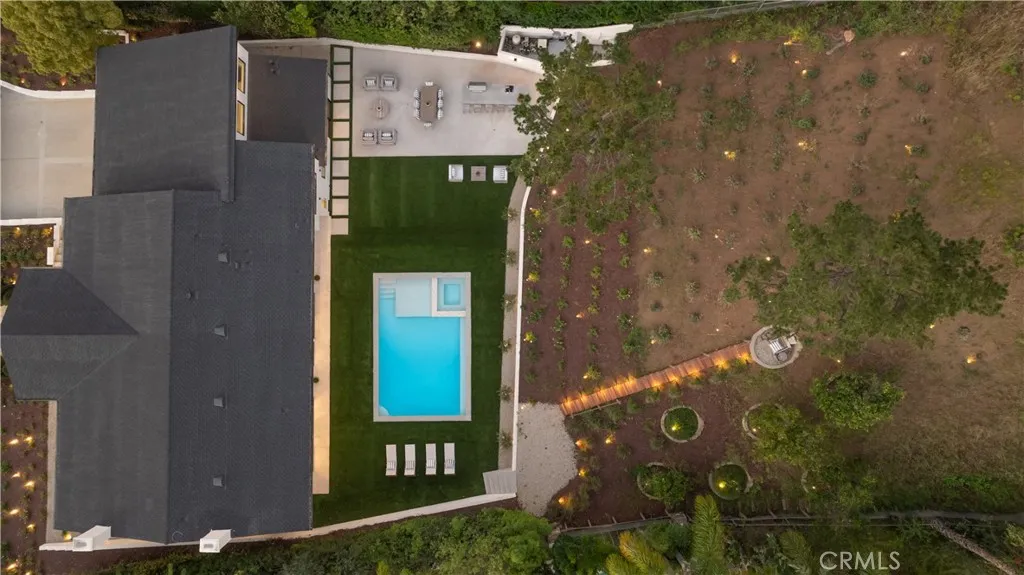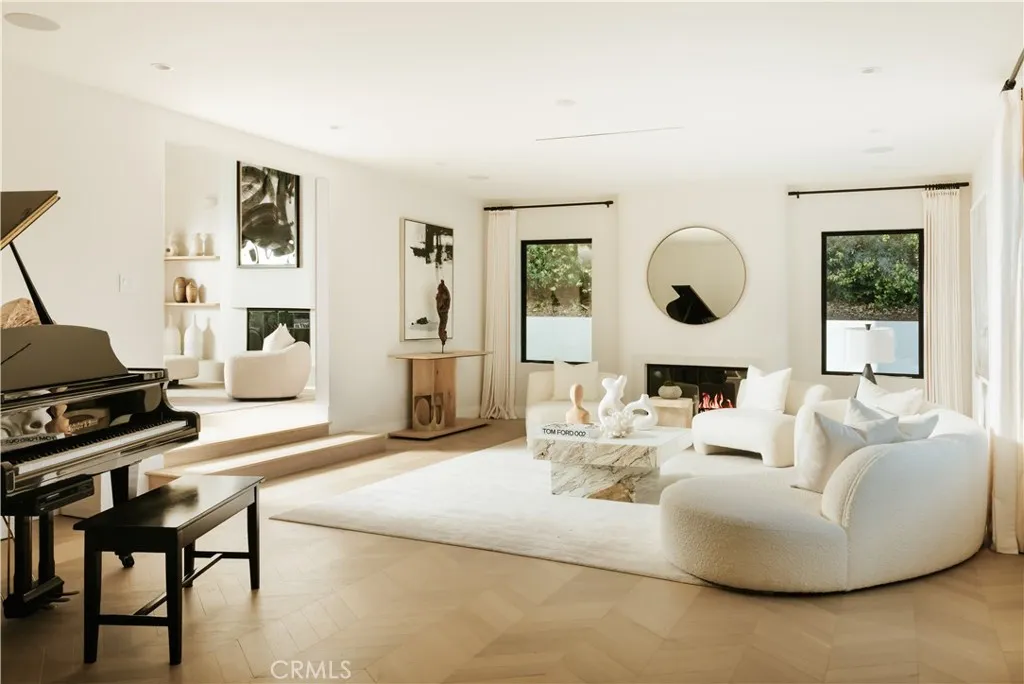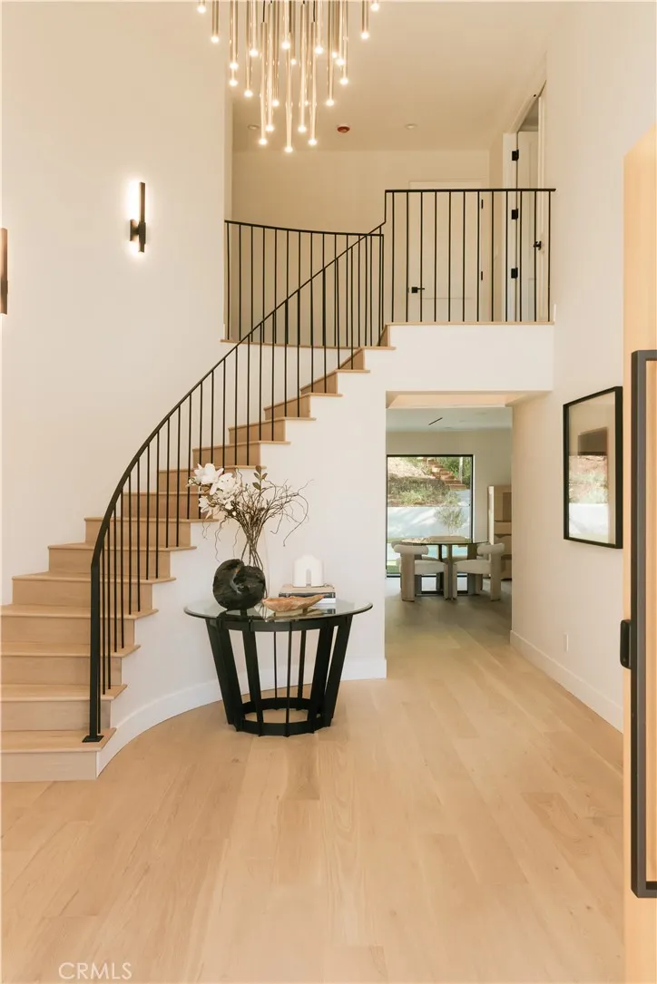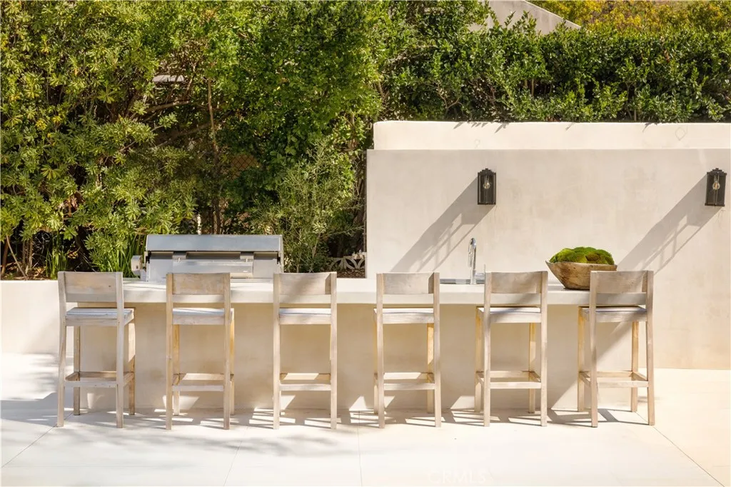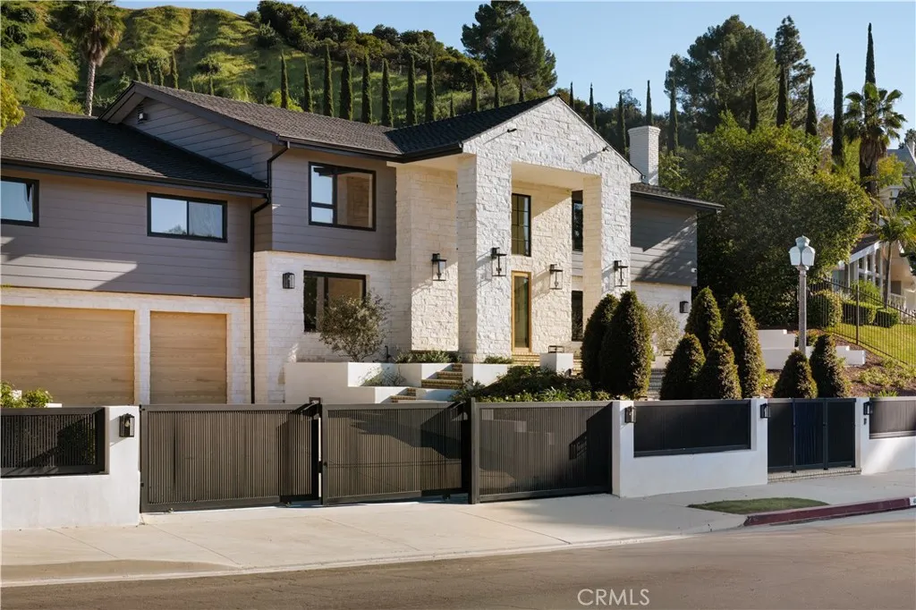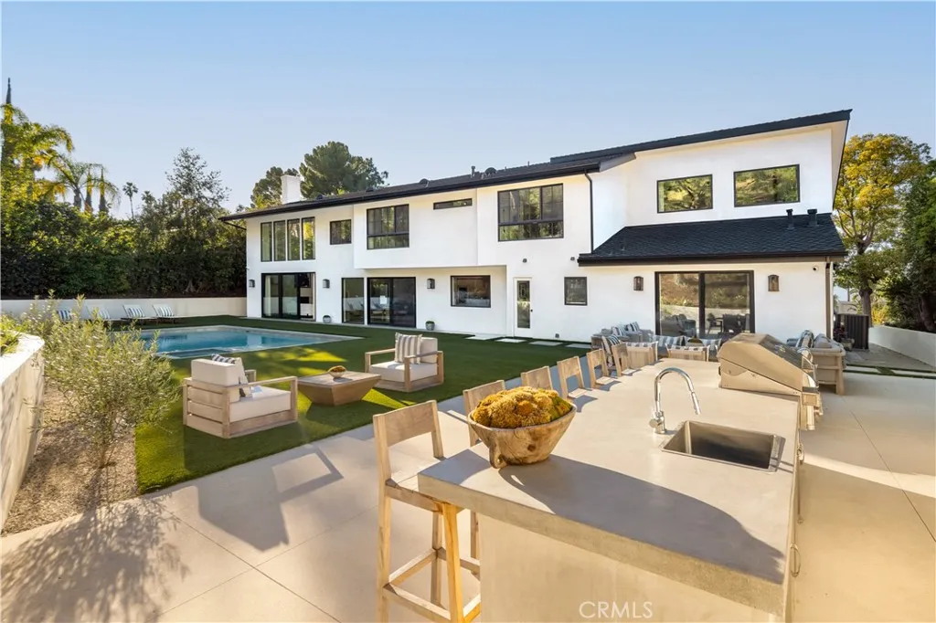 Situated in the coveted hills of Encino, this beautifully redesigned residence offers modern elegance, privacy, and sweeping views. Originally known as the iconic Karate Kid House, featured in the classic film The Karate Kid, the property carries a unique piece of Hollywood history while now showcasing a thoughtfully reimagined modern living experience. A welcoming entry introduces soaring ceilings, a striking staircase, and wide plank wood flooring that flows throughout the home. Generous living and entertaining spaces are framed by large windows that fill the interiors with natural light while capturing lush greenery and scenic hillside vistas. Living areas are anchored by sleek fireplaces, creating warm and inviting environments ideal for both everyday living and entertaining. The gourmet kitchen is thoughtfully designed with custom cabinetry, high end appliances, a large center island with seating, seamlessly opening to the surrounding living and dining spaces. Upstairs, a spacious recreation room with vaulted ceilings and exposed wood beams offers a versatile gathering space perfect for a media lounge, game room, or relaxed family living. The primary suite provides a peaceful retreat, featuring a spa inspired bathroom with a soaking tub, oversized shower, dual vanities, and an expansive walk-in closet. Designed for both entertaining and everyday enjoyment, the backyard offers a true resort like setting with a pool and spa, multiple lounge and dining areas, an outdoor kitchen and BBQ, and lush landscaping that extends up the hillside, creating a private outdoor environm