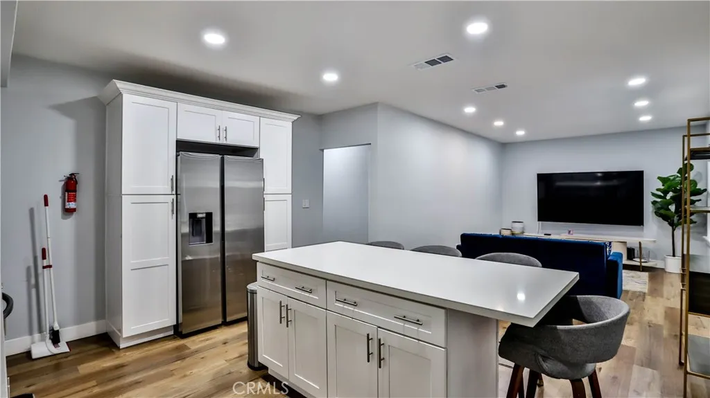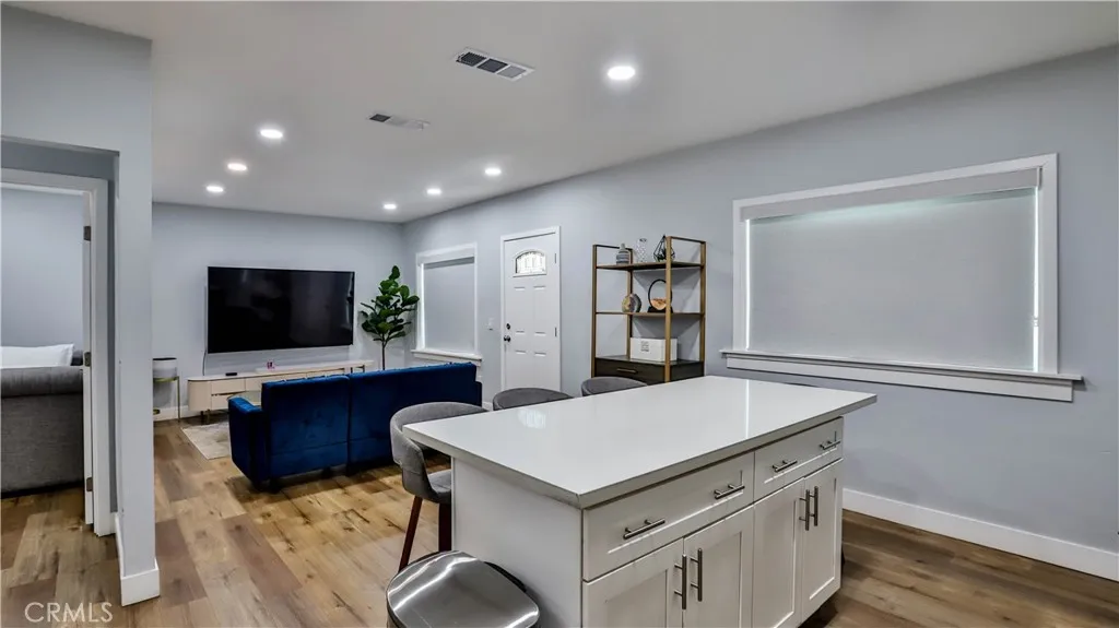 Property to be delivered vacant by close of escrow. Beautifully Remodeled Home with a Separate ADU. Rent one and Live in the other. The Main Home has 3 bedrooms, 1 bathroom, and 1148 sq ft living space. Step inside to a turn-key unit with a large open living room to the kitchen area. This open floor plan features the living room, dining, and kitchen all together in one cohesive space. This unit offers brand new luxury vinyl flooring, brand-new paint, and recessed lights throughout. The kitchen is fully modern with white cabinetry, quartz countertops, and stainless-steel appliances. The bedrooms have ample closet space. The bathroom is luxuriously upgraded with large format tile detailed walls, LED light-up mirror, brand new vanity, and shower. Other great features include recessed windows. ADU has 1 bedroom 2 bath with an office that you can put up a wall and make it another room. The back of the lot has a 2-car garage.