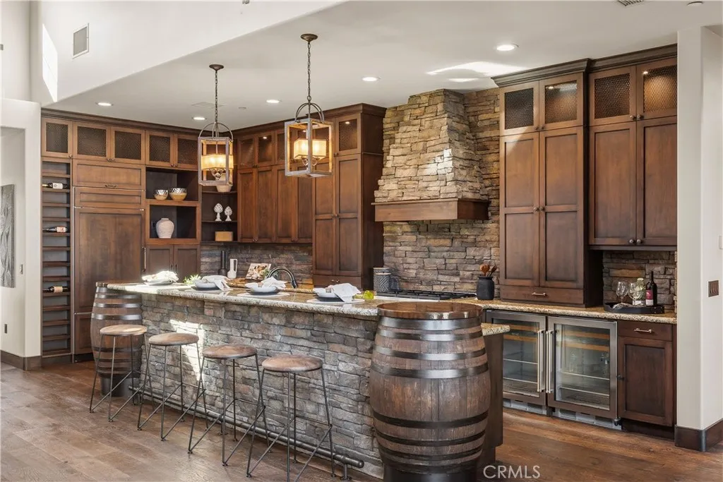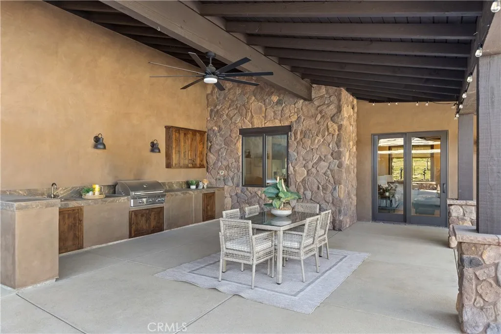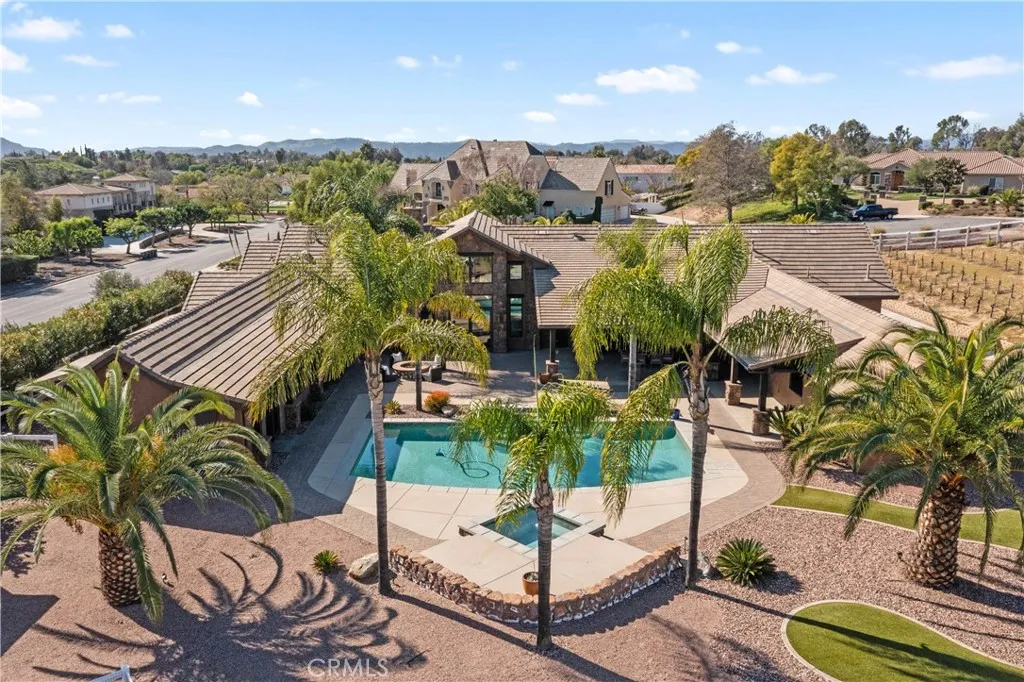 Premier Wine Country Estate with Vineyard & Multi-Generational Design. This exceptional Temecula estate offers 6 bedrooms, 5 bathrooms, and approximately 5,031 square feet of thoughtfully designed living space, perfectly suited for multi-generational living or flexible use. The home is intelligently divided into two distinct wings: the main wing features four oversized bedrooms along with a theater room or office, while the secondary wing functions as a private living suite complete with two bedrooms, a full kitchen, dining and living areas, a shared bath, and direct garage accessideal for extended family, guests, or potential rental use. The gourmet kitchen showcases a Wolf range, Sub-Zero refrigerator, wine fridge, and rich custom wood cabinetry, complemented by durable commercial-grade wood plank flooring and soaring two-story ceilings that flood the home with natural light. Nearly every room overlooks the heart of the propertyan entertainers dream featuring a saltwater PebbleTec pool, putting green, gas fire pit, full outdoor kitchen, and approximately three-quarters of an acre of income-producing vineyard. Additional highlights include a luxury lighted chicken coop, raised garden beds, powered storage shed, oversized three-car garage with extensive storage, and a fully finished attic large enough for a future game or bonus room. Fully gated with RV parking and hookups, low-maintenance landscaping, and the rare advantage of city water, natural gas, and sewerwith no HOAthis one-of-a-kind property is just minutes from Temecula Wine Country, shopping, and freeway access. A
